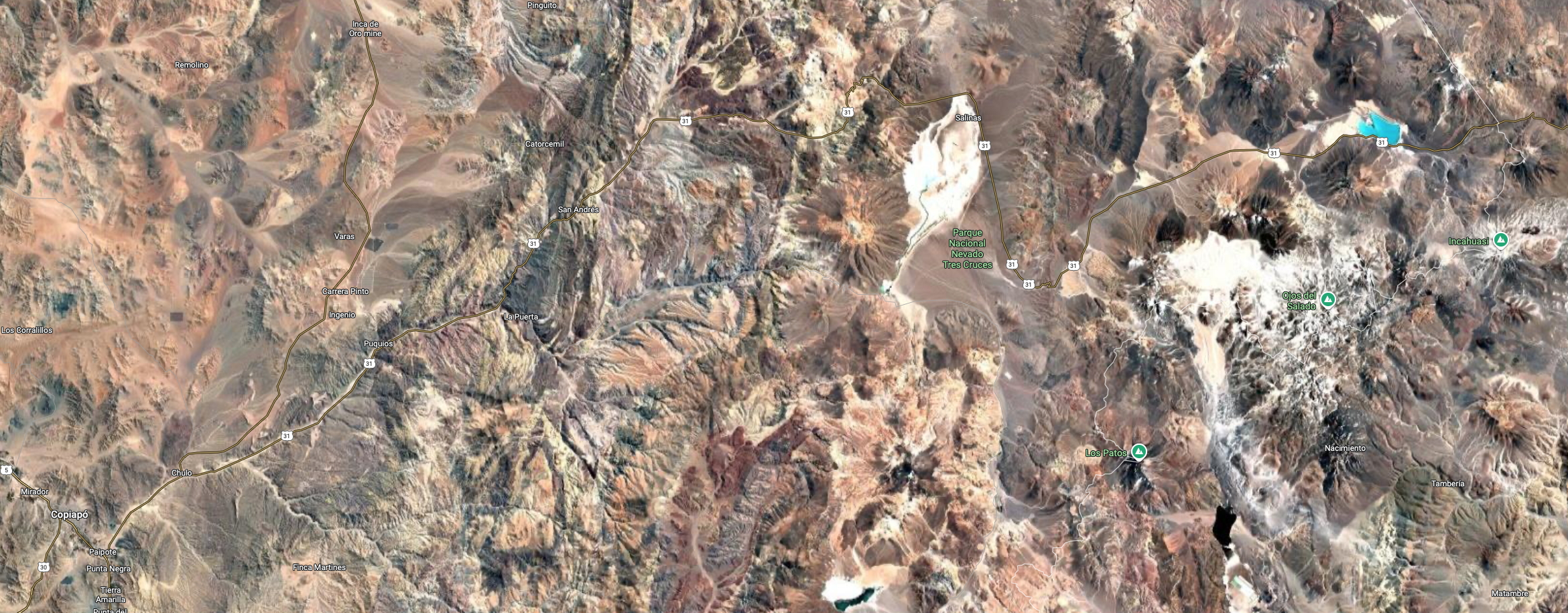 Atacama Desert. On the final leg of the trip, I drove north to Copiapó, where I obtained this photo of the clear blue sky from the balcony of my hotel. The above photo of the barren hills in the Atacama Desert (the driest place on Earth outside of Antarctica) was obtained during a drone flight to the east of Copiapó. After a night of using the Vespera 2, I decided to start the trip back to Buenos Aires. I wasn’t aware of the difficulty of the drive across the Atacama Desert (six and a half hours with no services) and over the Andes (15,505 foot pass). The landscape in the Atacama Desert is painted in many colors, as can be seen in this satellite image (Copiapó is to the lower left; Laguna Verde and the pass at the border are to the upper right). I started the drive in the middle of the day and wanted to be sure to arrive at the border station before it closed. To save time, I passed up many spectacular photo opportunities that arose as the colors changed around each bend. I made only a few stops and got photos of Laguna Verde and Guanacos. After I arrived in Fiambalá, an attendant at a gas station accidentally filled the tank of my rented Toyota Corolla with diesel fuel. When the mistake came to light a few blocks down the road, I returned the car to the gas station. A Good Samaritan customer at the gas station helped me get my luggage (loaded with valuable cameras and other gear) to a $20 hotel down the street (which was actually fairly nice). I was concerned about what would happen if the car couldn’t be fixed and driven back to Buenos Aires. The next morning, a mechanic drained the tank through a hose attached under the back seat. To my great relief, the car ran well after the tank was filled with gas. After an amazing road trip, it was wonderful to make it back to Buenos Aires and then back home the next day (just in time for a family gathering for Thanksgiving).