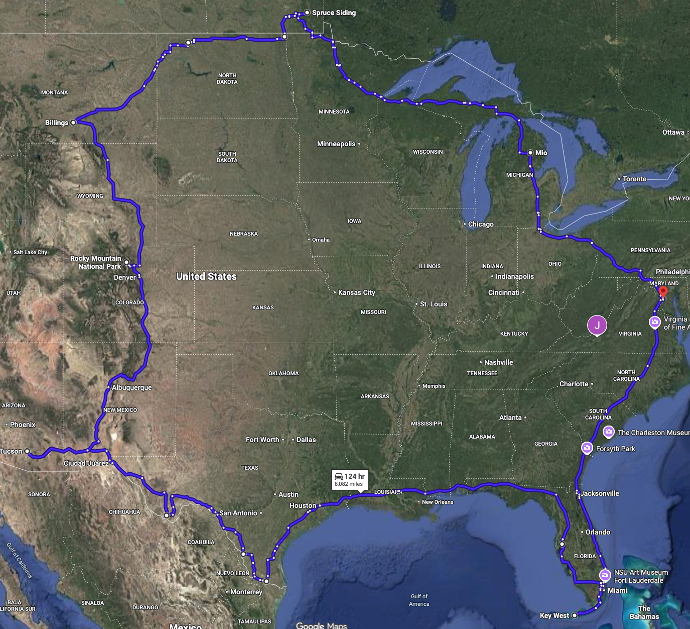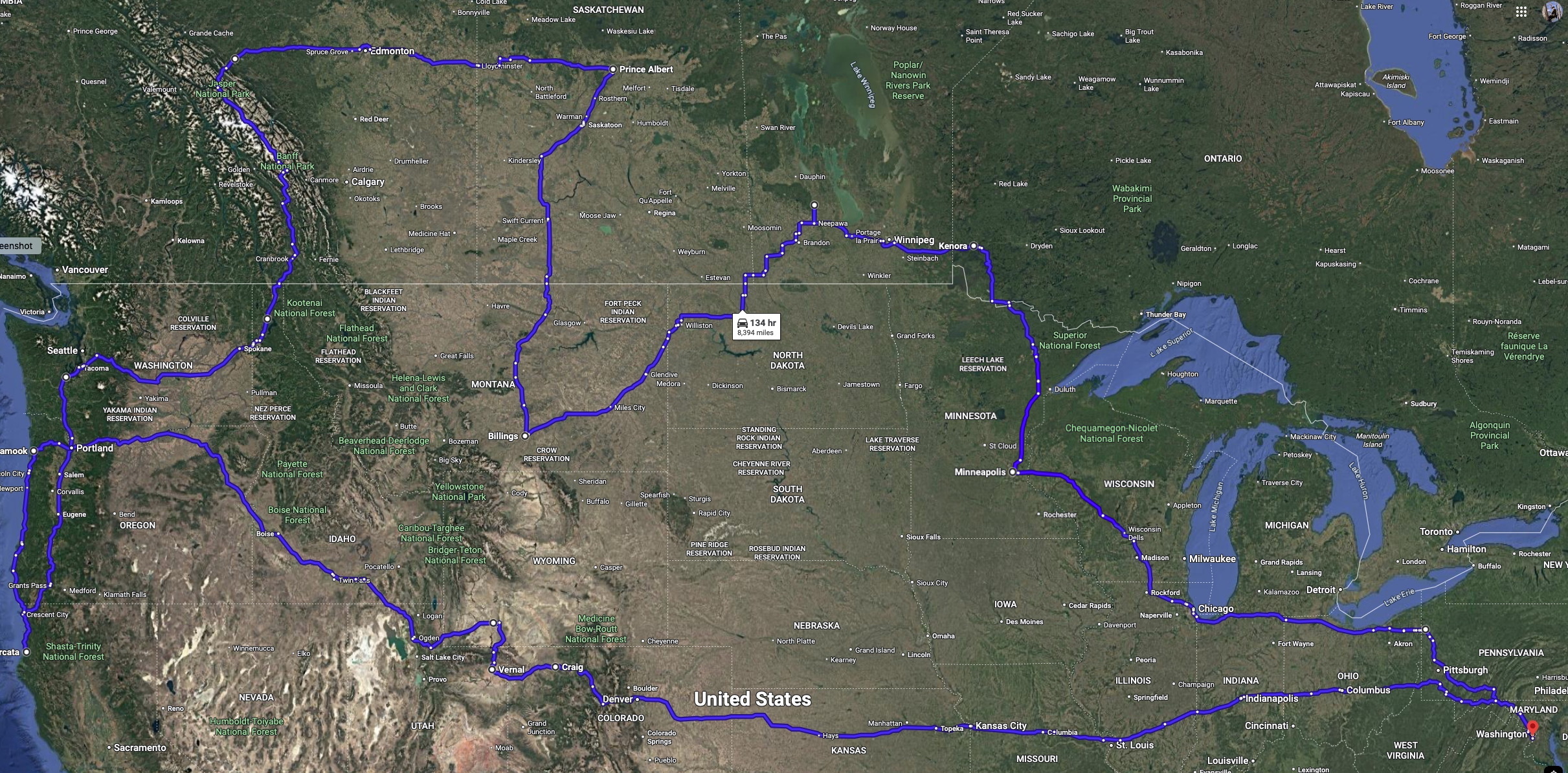 During the summer of 2024, I took a 17,964 mile road trip across North America. Photos, videos, and audio recordings from the trip are presented here. The purposes of the trip were to look for Connecticut Warblers and other birds and enjoy the scenery. Birds are most active and easiest to find in June, but higher elevations at some of the parks are closed until later in the summer. So it made sense to do the trip in two phases. I began the first phase, which appears (minus side trips to Glacier and Crater Lake National Parks and other sites) in the above map (click here for a larger version), in Alexandria, Virginia, on May 29. After stopping to visit relatives in Pennsylvania, I drove north to Kenora, Ontario, and then west to Riding Mountain National Park and Duck Mountain Provincial Park in Manitoba. After going south to see relatives in Montana, I drove back north to Prince Albert National Park in Saskatchewan and then west to Jasper and Banff National Parks in Alberta and British Columbia. I made a stop near the northern tip of Idaho to deploy a game camera that transmits photos by cell and has a solar panel. I then drove back into Montana to Glacier National Park. After a brief stop to reposition the game camera, I headed west to Seattle, Olympia, Portland, Crater Lake National Park in Oregon, Prairie Creek Redwoods State Park in northern California, and Tallimook in Oregon. During the trip back to the east, I visited Powder Mountain and Great Salt Lake in Utah, Dinosaur National Monument in Utah and Colorado, and Ft. Riley in Kansas. The trip odometer read 11,452 miles when I arrived back in Alexandria just after midnight on July 2. During the second phase of the trip in August, I visited Yellowstone National Park, returned to Idaho to upgrade the game camera setup, visited areas in Glacier National Park that were closed in June, and revisited Dinosaur National Monument. I drove 6,512 miles during the second phase for a total of 17,964 miles. During a 12,500 mile road trip in 1997, I didn’t own any cameras. For this trip, I had a Nikon Z6ii, 400 and 560 mm lenses, a 24 to 200 mm zoom lens, a DJI Phantom 4 Pro drone, a Sony PCM-D100 audio recorder, and a Sony 4K video camera.