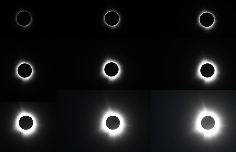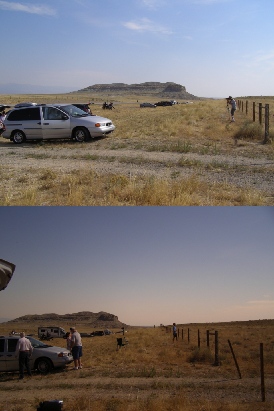 I watched the eclipse of August 21, 2017, near the Boysen Reservoir just to the north of Riverton, Wyoming. My primary objective was to film the approaching shadow with a drone, but I brought along a Sony HDR-HC5 video camera. Since totality would last for only a few minutes, I decided on a plan that would allow me to start the drone and video camera and then focus on enjoying the spectacle. Ten minutes before the start of totality, I launched the drone and left it hovering at an altitude of 120 meters. Immediately after the start of totality, I aimed the video camera at the Sun and left it recording from a tripod. It’s easy to see the motion of the shadow by scrolling back and forth through the drone footage, which may also be viewed at normal speed. The other video shows features of the corona that appear in high-quality images. During the partial phases of the eclipse, there were obvious drops in temperature and light, as illustrated in these photos.