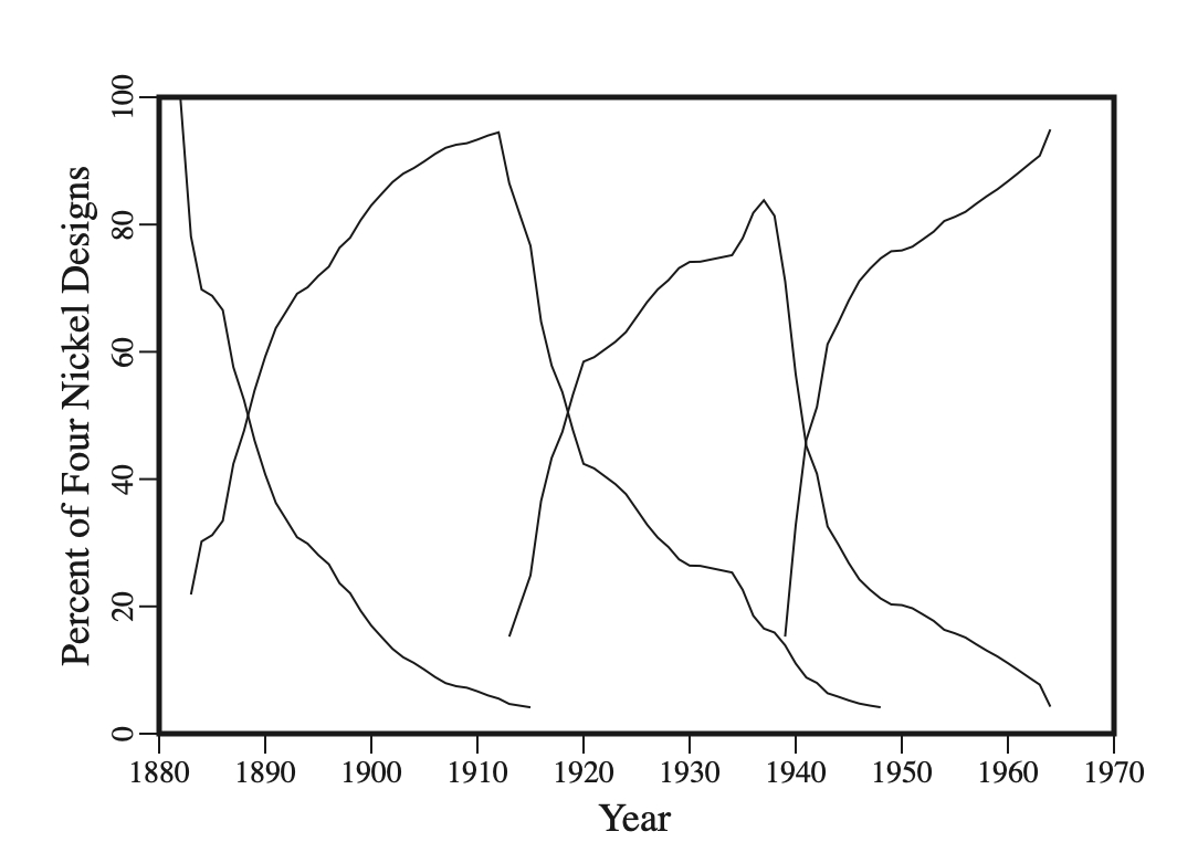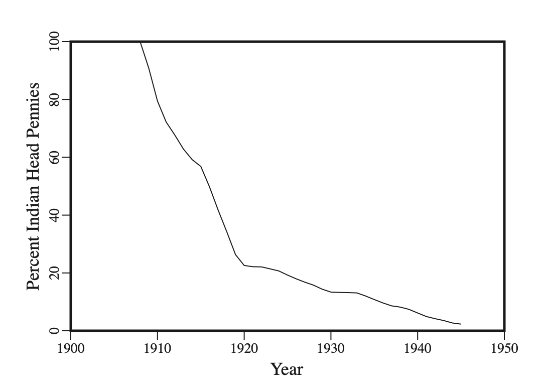 My grandmother got me interested in coin collecting in the early 1960s. My favorite coin was the Buffalo Nickel (1913–1938), which was rapidly disappearing from circulation by the mid 1960s. In order to gain insights into the variation over time of the population of Buffalo Nickels in circulation (relative to the total number of nickels of all designs in circulation), I used a simple model in which 4% of all nickels disappear from circulation each year. I used the number of nickels produced each year since 1866 as inputs to the model. There is uncertainty in the attrition rate, which would be expected to vary with time (e.g., attrition increases as a design becomes rare and gets pulled from circulation at a higher rate). I decided to terminate the above graph at 1964, when the interest in coin collecting increased with the introduction of the Kennedy Half Dollar and the end of 90% silver coins. The prediction of a rapid decrease in Buffalo Nickels during the early 1960s is consistent with my experiences as a collector during that period. I also applied the model to all four nickel designs (Shield, Liberty Head, Buffalo, and Jefferson) and the Indian Head Penny (1859–1909), which I never found in circulation.