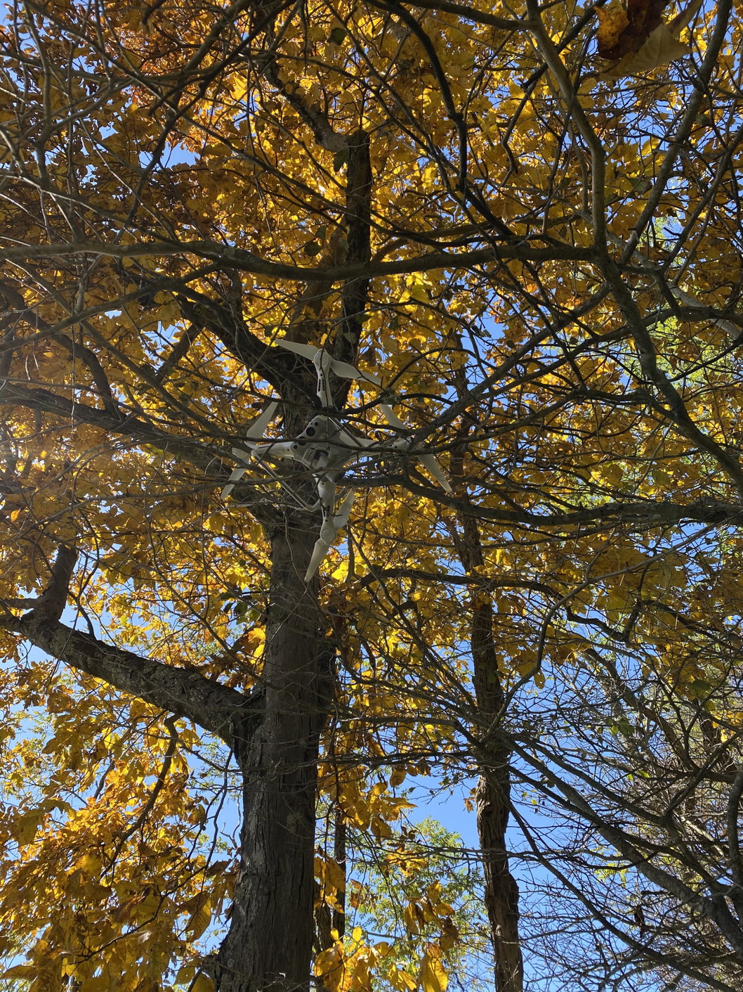 In October 2020, I used a drone to obtain images of the autumn foliage in the Appalachians of Virginia, North Carolina, and Tennessee. The images may be viewed in high resolution here and in a slideshow here. This project nearly came to an end when I crashed the drone into a tree. As can be seen in this image, however, I was very fortunate that small branches gently caught the drone with no damage other than a broken prop.