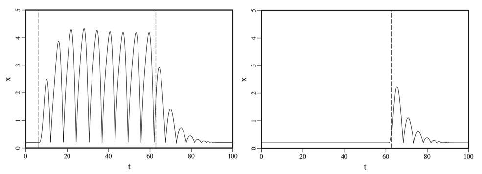 this article, the drumming of a Pileated Woodpecker is driven by periodic vibrations of the body, and there are a few additional blows of decreasing amplitude after the driving force is turned off. This suggests that a drumming woodpecker may be modeled as a harmonic oscillator in which the bird is anchored with its feet and tail and the restoring force corresponds to tension in the neck and body. The graph on the above left corresponds to a damped harmonic oscillator in which periodic forcing is turned on at the first dashed line and turned off at the second dashed line. After a brief transient, the response is periodic. After the forcing is turned off, there is a transient that is consistent with the observed drumming of a Pileated Woodpecker. The graph on the above right corresponds to a damped harmonic oscillator with impulsive forcing. The response is a transient similar to the one appearing to the right of the second dashed line in the graph on the above left. This model accounts for (1) the double knock in the 2007 video, (2) the double knock of a Pale-billed Woodpecker that is discussed in Movie S2 of this article, and (3) the multiple knocks of some Campephilus woodpeckers, such as those of a Crimson-crested Woodpecker in this recording.