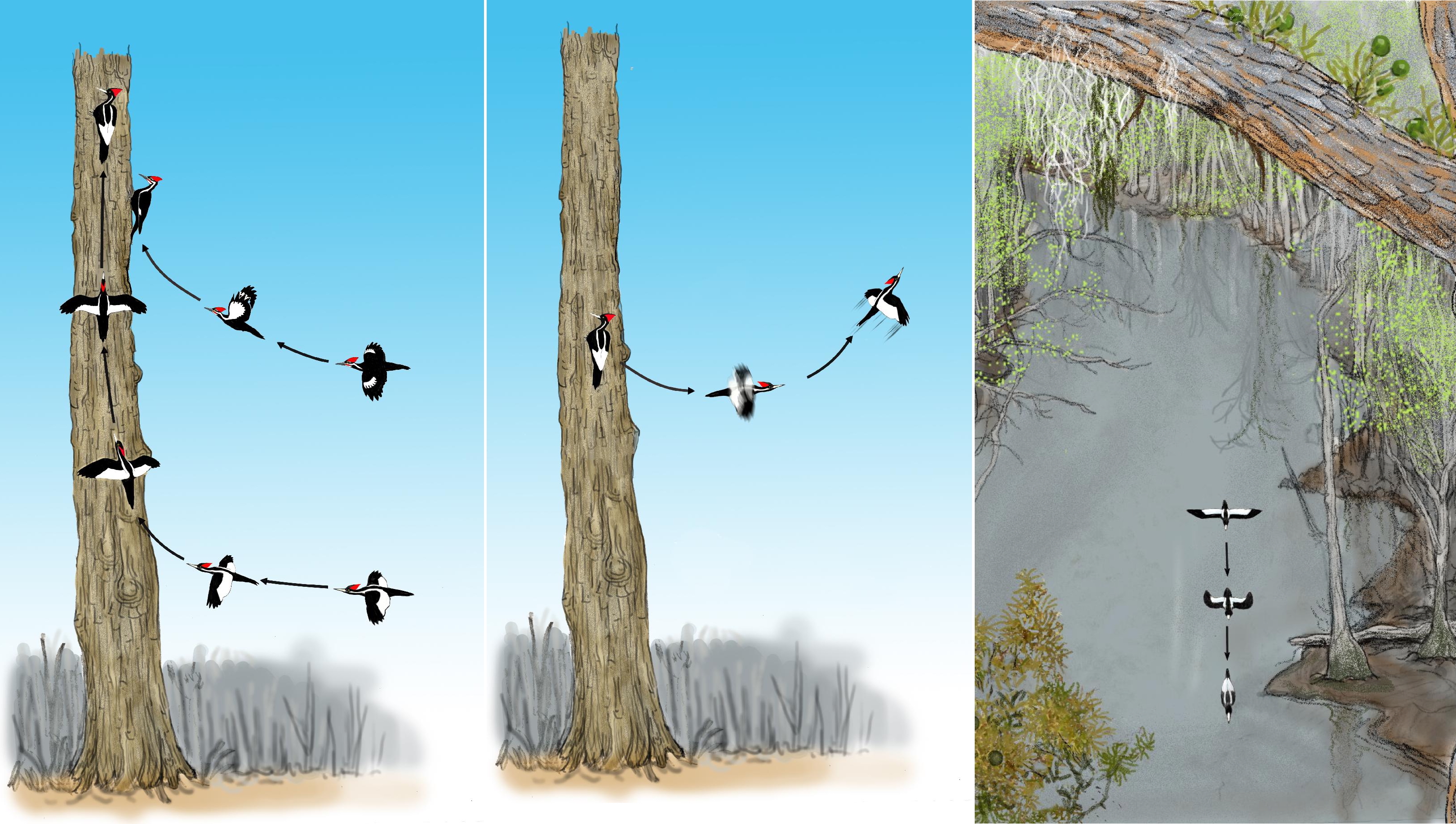 Flights of the Ivory-billed Woodpecker. According to the great naturalist, John James Audubon, the flight of the Ivory-billed Woodpecker is “graceful in the extreme.” This account indicates that there must be something extraordinary about the flights of this bird, but for several decades it appeared that specific details about the types of flights that inspired the account were lost forever. Since no flights appear in the film that was obtained at one of the last known nests in 1935, historical accounts were until recently the only information that existed about the flights of the Ivory-billed Woodpecker. Several types of flight appearing in the videos may be viewed in movies that accompany the up-to-date summary. Michael DiGiorgio produced the above illustrations of flights (click here for a high-resolution version).