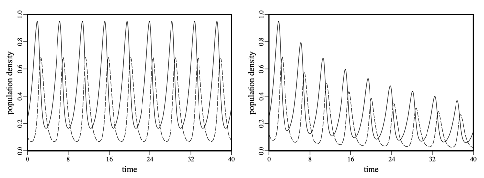 As with all other living things, humans have traits that were molded by natural selection. In the struggle to survive, early humans needed robust senses and other physical traits in order to find food and avoid predators. After the advent of civilization, many of the factors that shaped us into what we are ceased to exist. Without those factors to keep the gene pool strong, certain traits (such as vision, hearing, strength, balance, and stamina) would be expected to degrade. As discussed here, this gradual loss of genetic information could have a profound effect on our species in the long run. This topic may be thought of in terms of a mathematical model in which the populations and traits of species are governed by a system of equations. A few simple examples are illustrated in the figures above. On the left is a solution of Volterra’s prey-predator equations in which there are periodic variations in the populations of the prey (solid curve) and the predator (dashed curve). The predator benefits from an increase in the population of the prey, but with a slight delay. After the population of the prey is reduced by predation, the population of the predator declines, and the cycle repeats. On the right is a slightly more complicated model in which the quality of the habitat degrades with time, making it harder for the prey to hide from the predator. In this case, the degraded habitat causes a decline in both populations. Although it would be difficult to explicitly formulate a model that accounts for a complex ecosystem that includes humans, mathematical modeling concepts can be useful for gaining insights into such an ecosystem. In natural selection, the traits of a species arise in response to factors related to interactions with other species and the environment. Such factors can be represented by forcing terms in a mathematical model. Although the dawn of civilization didn’t mark the end of all natural selection in humans, it was inevitable that certain survival-related traits would be gradually dulled or lost after the forces that molded them ceased to exist.