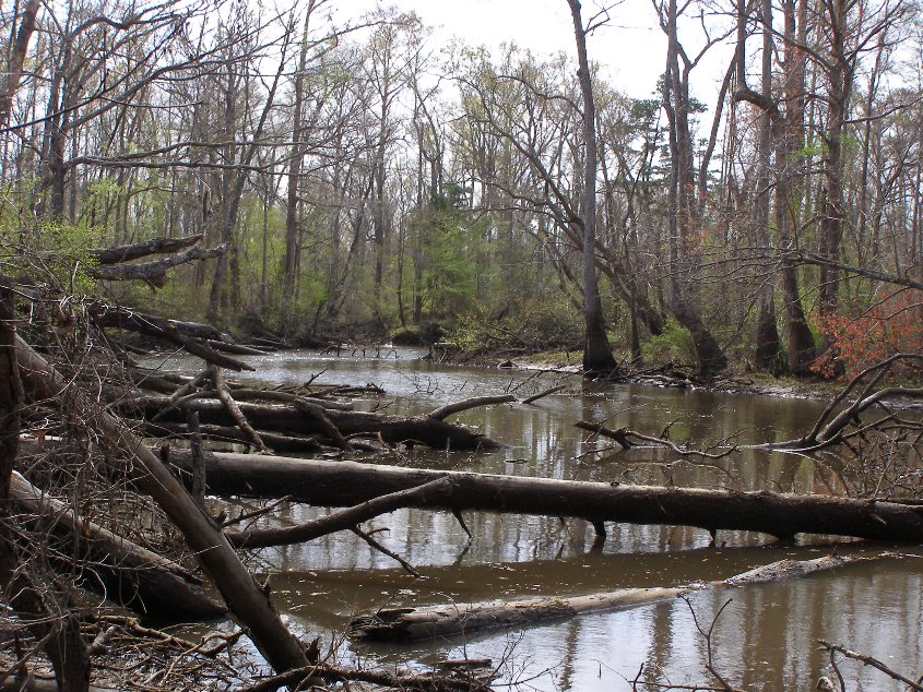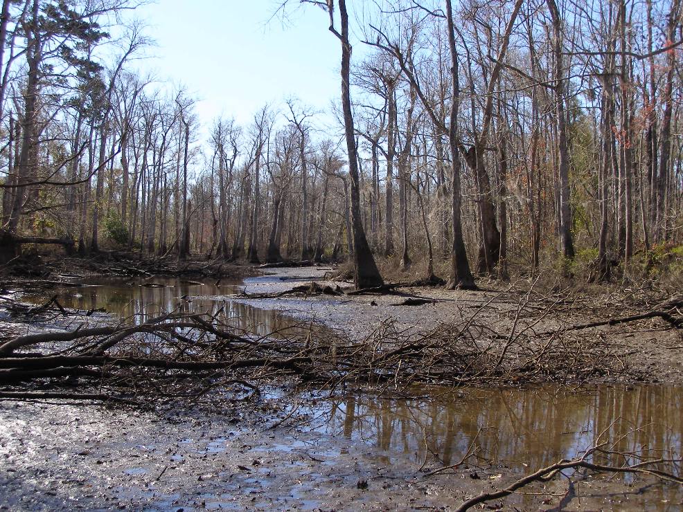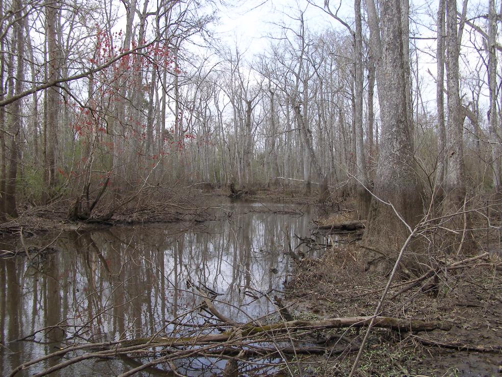 3-12-09. This morning, I did some exploring in the same general area where there have been possible sightings. I got as close as possible without getting into a major bushwhacking expedition. There are some fairly good stands of hardwoods in that area, which seems to have been hit with a slightly softer blow by Katrina.