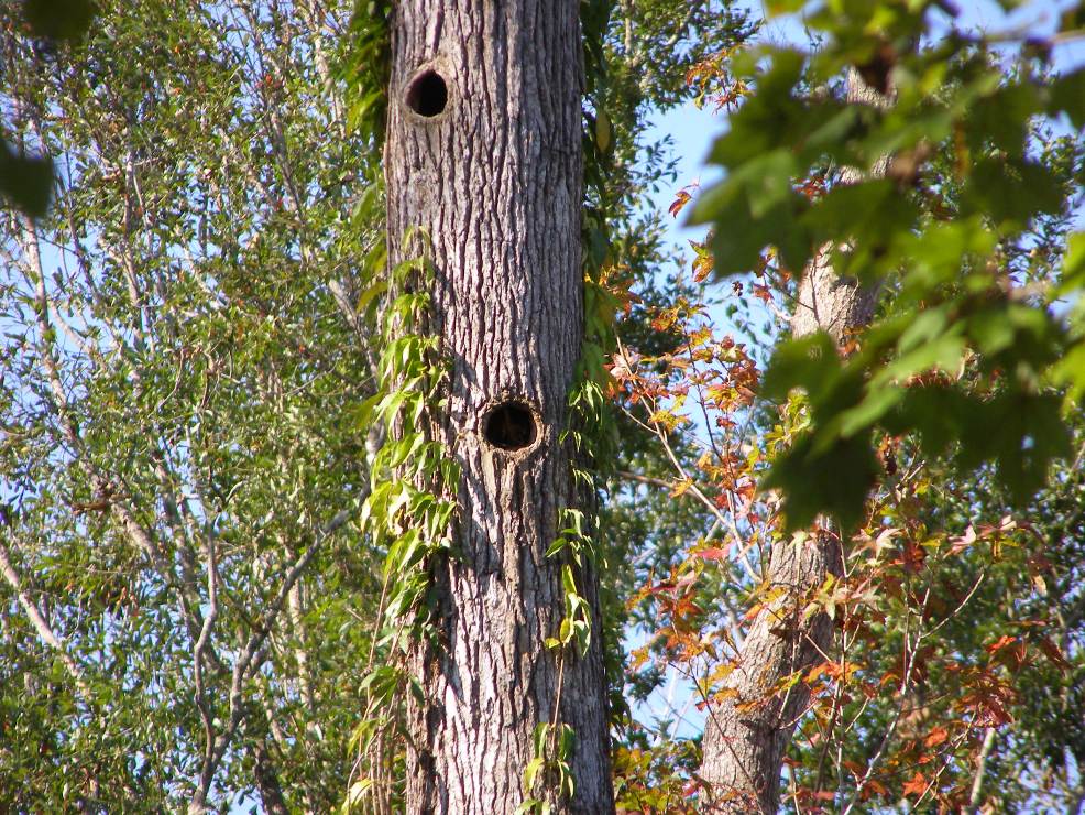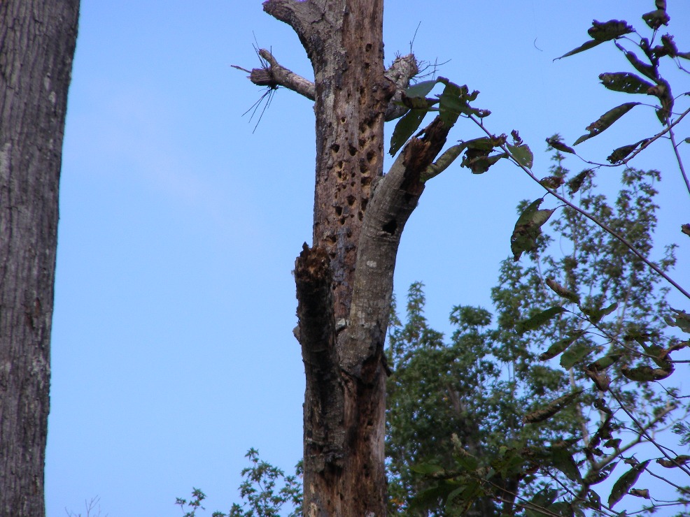 9-19-08. I returned to the area where I heard the double rap but didn’t have any luck this morning. While doing a stakeout near Tree 6, I saw a pileated enter a cavity about 65 feet above the ground in