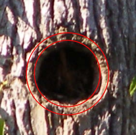 This scaled image shows one of the cavities that Tim the photographer recently found very close to the tree in which the bird was perched in the 2006 video. The reference circles are four and five inches in diameter. Whenever I’m in the field with visitors, it’s usually they who spot the interesting cavities, and this goes to show how inattentive I am to such evidence. It’s difficult to get a good look at Tree 8 since it’s nestled within fairly tall hardwoods,