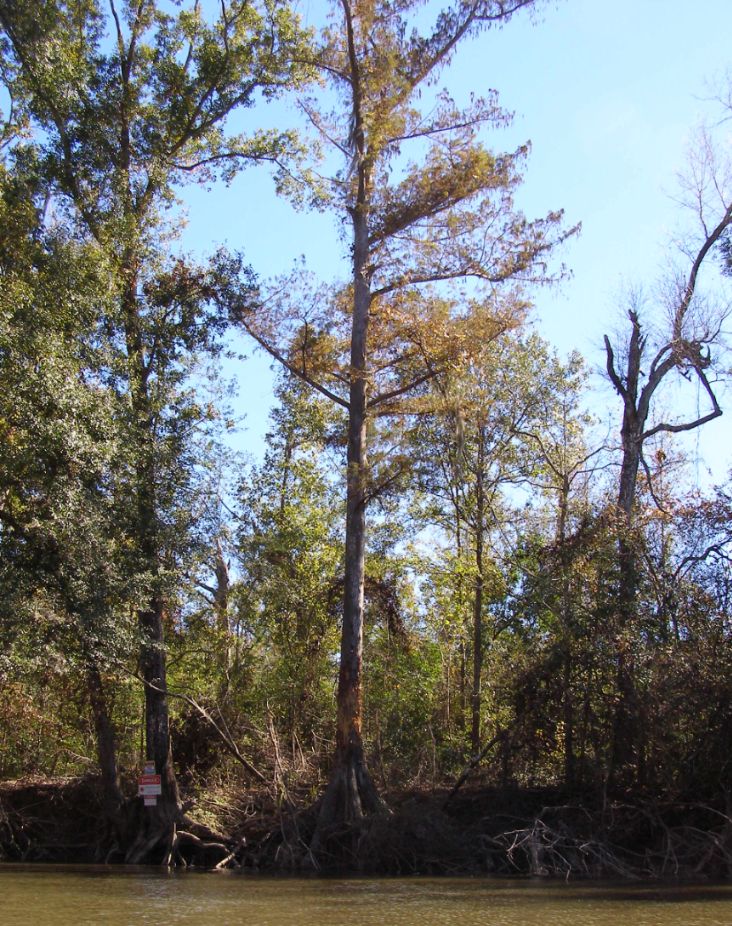 that Tim found yesterday and discovered that it has several large cavities. After the March 29 flyunder, the ivorybill veered in the direction of this tree, which is difficult to approach due to surrounding bayous, swamp, and thick vegetation and would seem to be a good location for a roost. On two occasions while doing stakeouts near Tree 6, I heard possible double raps coming from the direction of this tree. I found cypresses in good locations that appear to be climbable up to about 75 to 80 feet.
