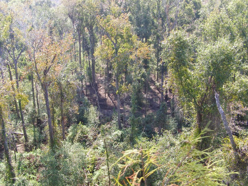doesn’t provide the greatest view (thus the subordinate name). I was pleased to get off a nice shot with the bow and arrow that placed the line over a large fork near the top of the tree. Although Tree 6.1 will be of limited use, there’s another tree that seems more promising several hundred meters away that I will try to get rigged within the next few weeks. We bushwhacked out in the direction of the fork tree that appears in the 2006 video. We failed to find the tree, but Tim spotted some