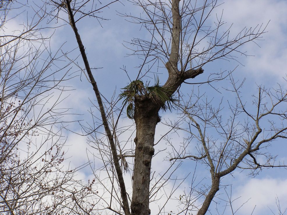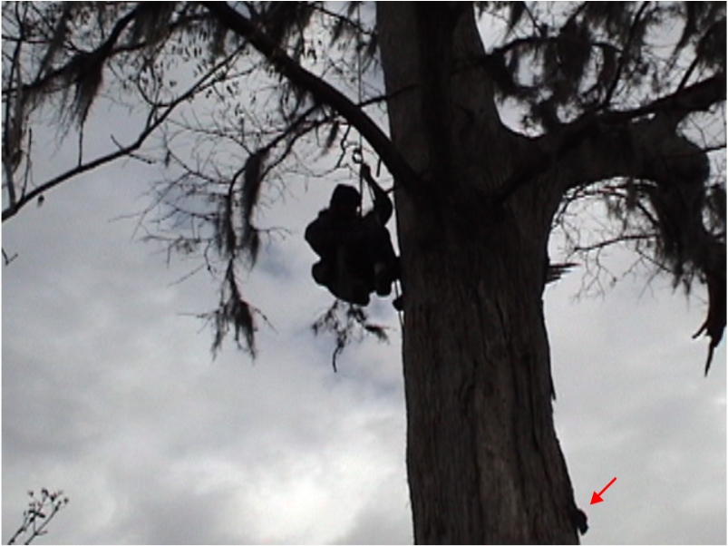 2-3-09. It was a gorgeous day in the swamp. After doing a few stakeouts, I tried a midstory climb. I chose a fork a little on the high side, and this was a good test of my accuracy with a beanbag. The first several throws were the equivalent of a baseball pitcher throwing the ball over the backstop, but then I got the hang of holding the line about a foot from the beanbag, spinning it in a circular motion, and visualizing the beanbag going over the desired fork just before releasing it. After I got the line in place, I discovered that the rope wasn’t quite long enough for that fork. Not an impressive start, but the practice should payoff on the next attempt.