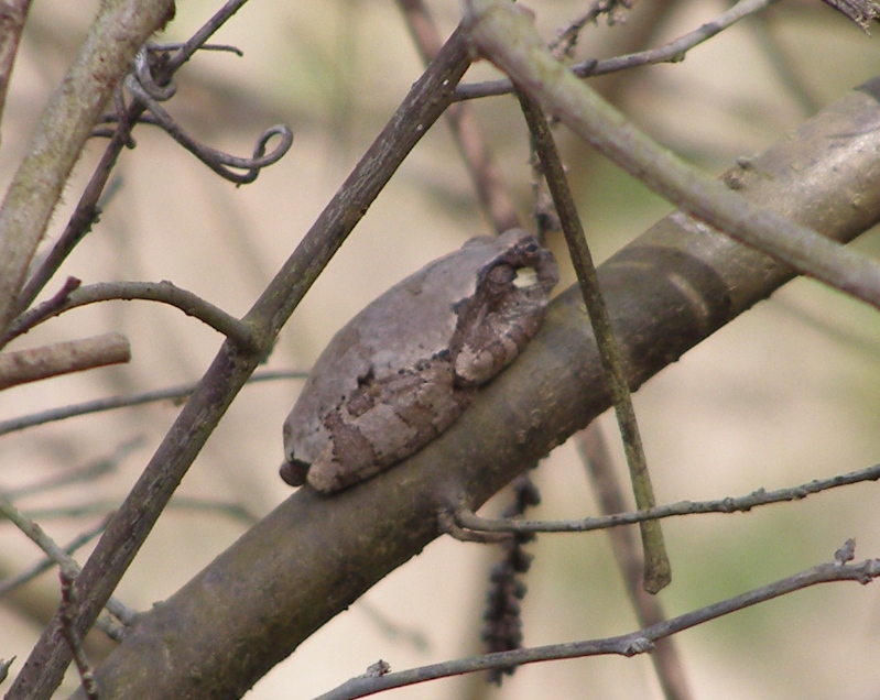 3-11-09. It was a quiet morning at the stakeout. During the walk out and back, I kept my eyes on the ground to look out for snakes and could have missed several ivorybill flybys. Mac from Alabama believes the frog that I saw a few days ago is a Bird-voiced Treefrog. It’s tricky to identify frogs due to considerable variations in appearance, but the voice and shape of the white patches under the eyes seem right. It was fortunate that this rarely-seen frog happened to be resting on a branch right next to my stakeout position.