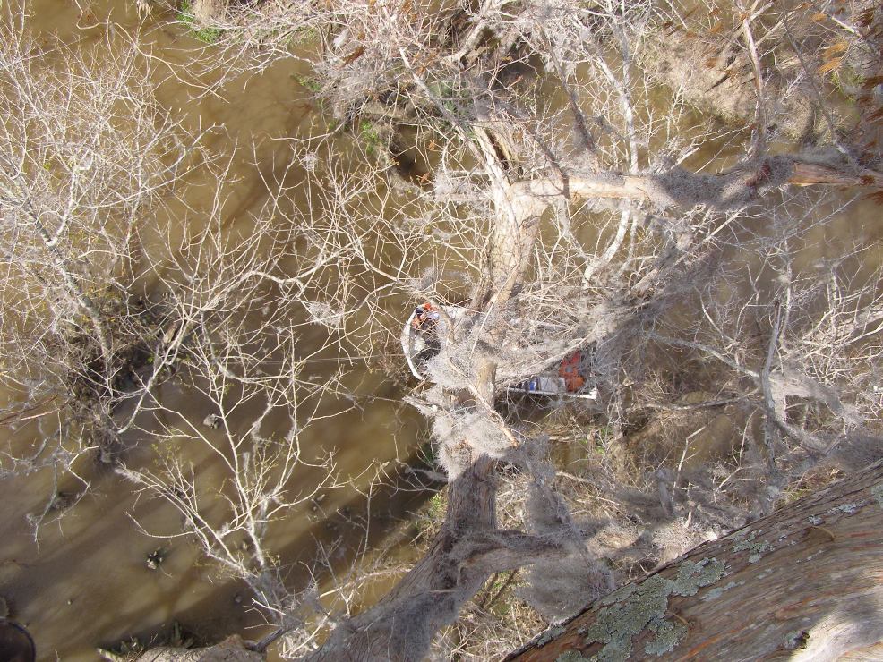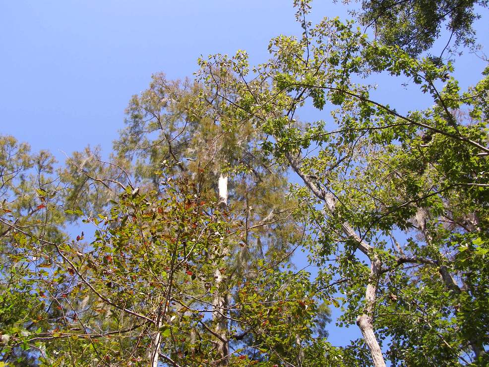 a spider that somehow managed to build a “web bridge” across the bayou. We took a closer look at the big cypress that Tim discovered a few days ago. I was considering climbing up to inspect the cavities, but after wading to an area that provides good binocular views, I decided that they aren’t quite big enough. We then proceeded to rig Tree 6.1, which is a few hundred meters from Tree 6 but