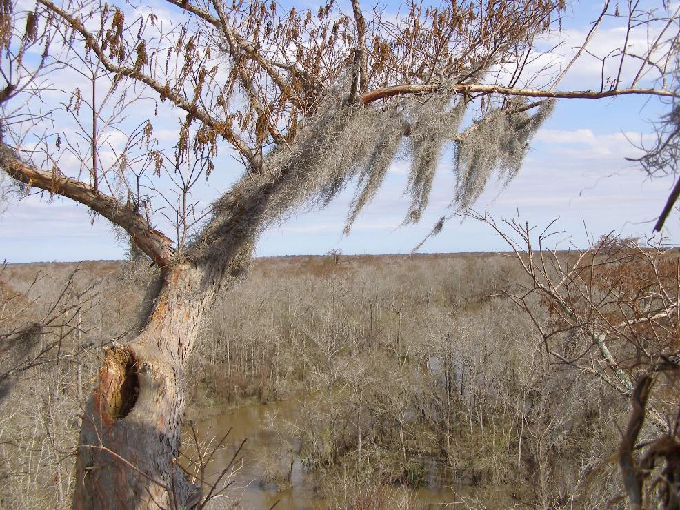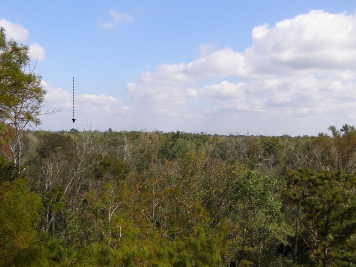 1-30-09. I did a stakeout at a split in a bayou that provides a good view in three directions. While at the stakeout, I got an idea for an approach that is intermediate between staying on the ground and climbing above the surrounding canopy. Midstory climbs require much less rope (lugging 200 feet of rope can be exhausting), don’t require exceptionally tall trees (making them possible just about anywhere), and aren’t as exhausting as canopy climbs (making multiple climbs per day possible). Midstory climbs don’t provide views out to long distances, but the view can usually be greatly improved just by climbing above the low vegetation (especially in winter).
