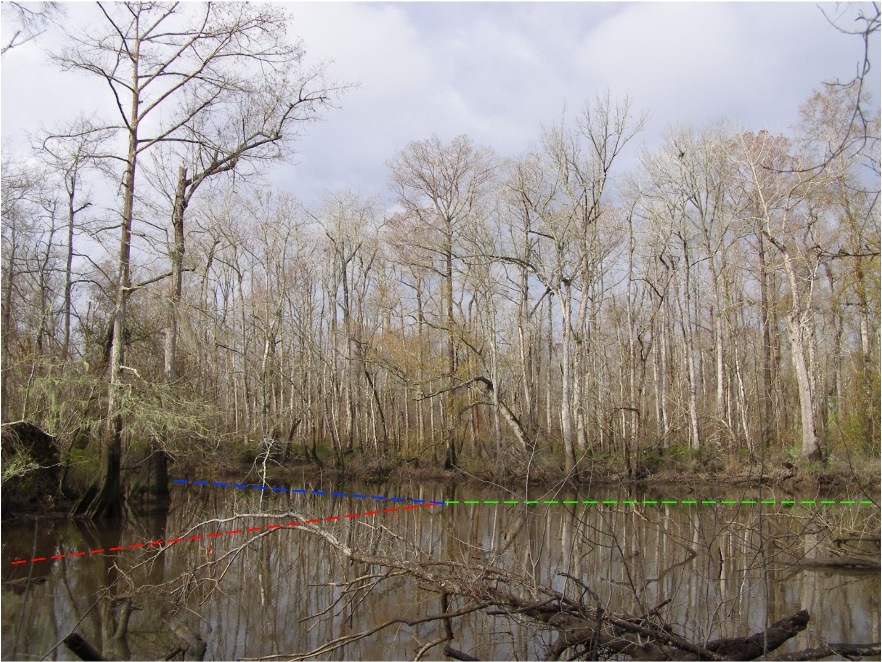 three-way junction. The 2006 video was obtained along the bayou that goes to the lower left (red). The 2008 video was obtained along the bayou that goes to the right (green). Tree 9 is located along the bayou that goes to the left (blue).