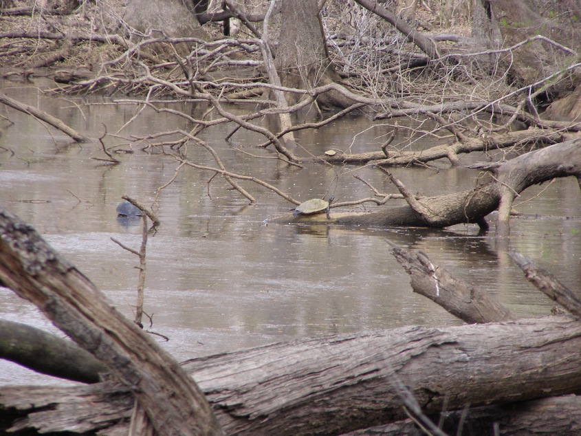 a speckled kingsnake. I found a fallen tree that cracked in a spiral pattern. On the way back, I managed to sneak up on these turtles. It was warm, leaves are coming out in the canopy, and there are lots of