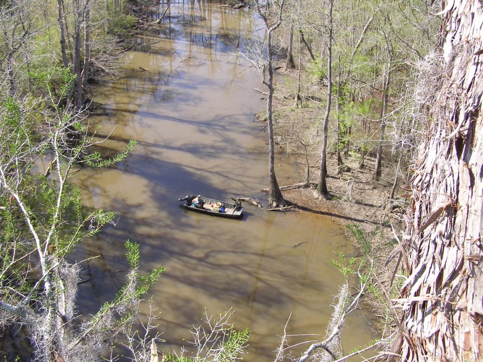 view from up there was nice with the leaves coming out. We traveled to Tree 6 on the water and passed through the 2006 hot zone. Just before we arrived at Tree 6, a large bird flew up and landed on a tree deep in the woods. I saw a large white patch that could have been the white triangle on a perched ivorybill. Based on the way it moved and disappeared, I had the impression that it may have been the bird, but we weren’t able to relocate it.