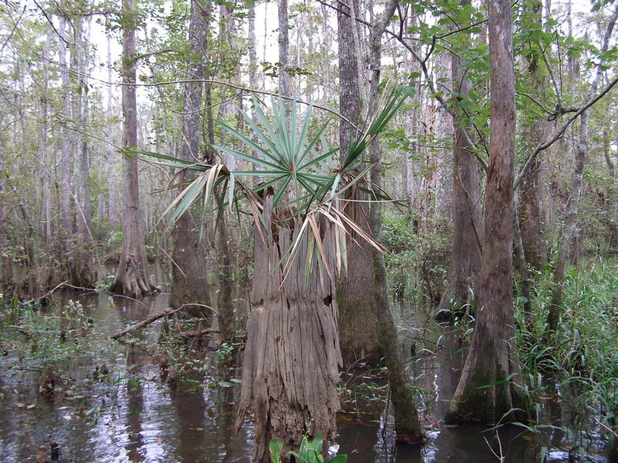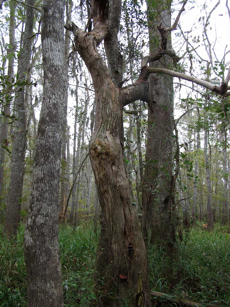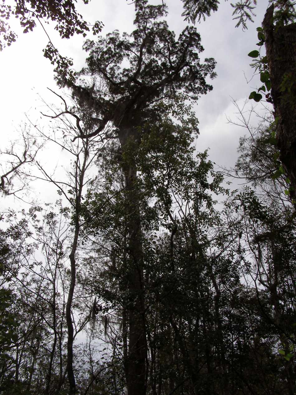 10-10-09. Frank and I parked along I-10 and hiked deeper into the big grove of cypresses than I had ever been. Although this secluded area is a few miles south of the hardwoods, the woodpecker activity was high throughout the day. There are many cypresses over 100 feet in the big grove, but one of the more interesting ones that we saw had the top broken off. In this photo, the top appears in the foreground and the bole appears in the background. The top landed right side up and gives the impression of a separate tree. The bole has several large cavities. We also noticed a palmetto growing in a long dead cypress.