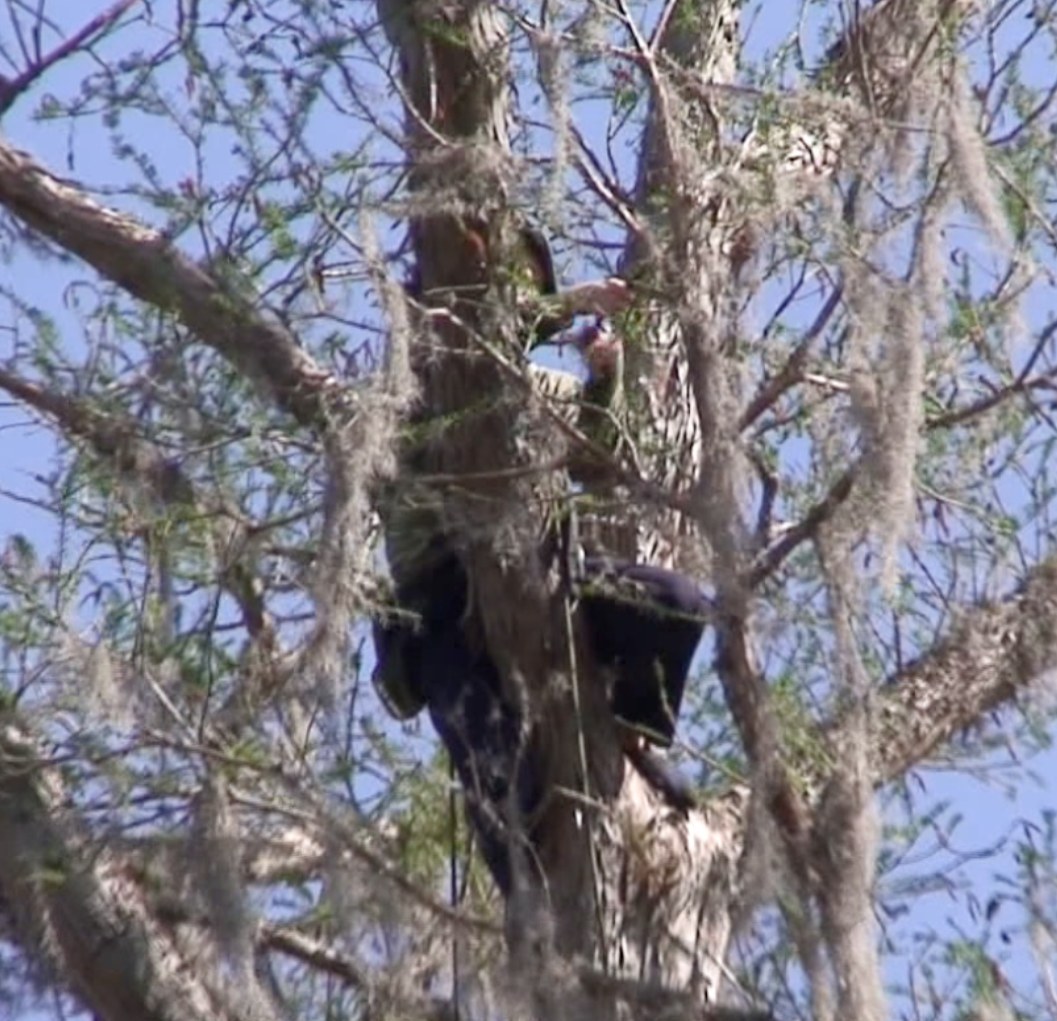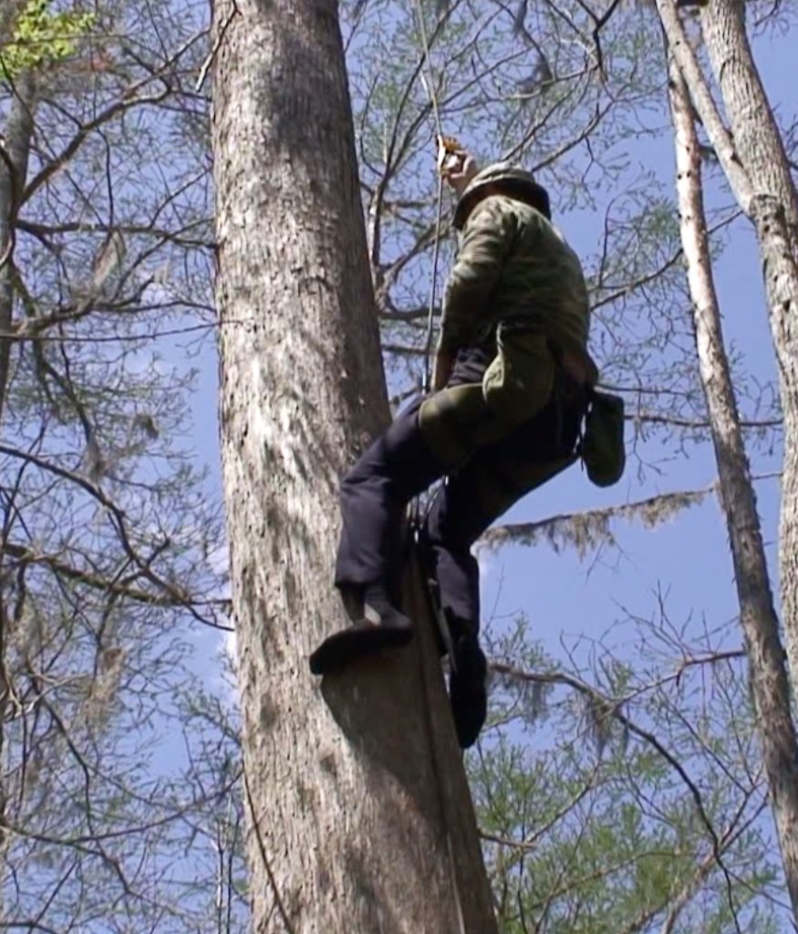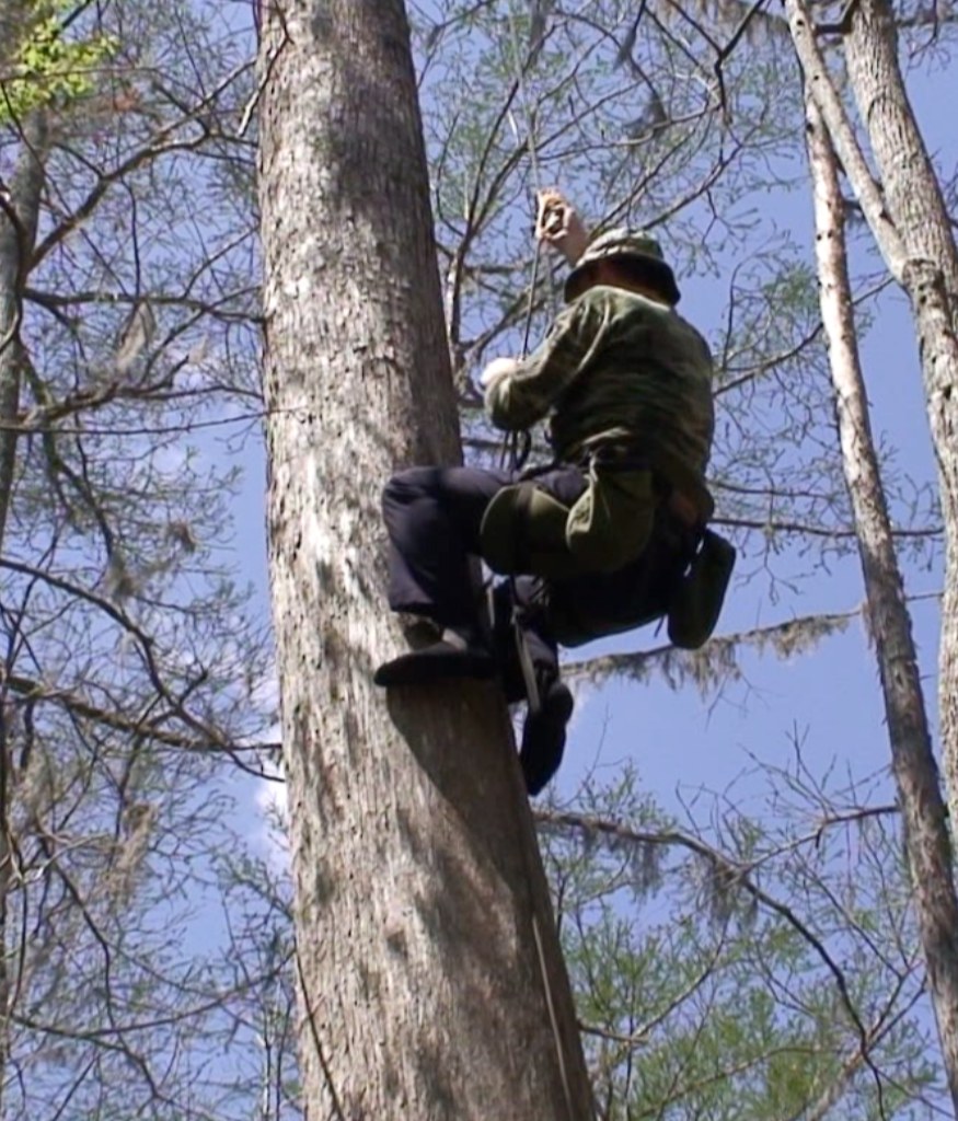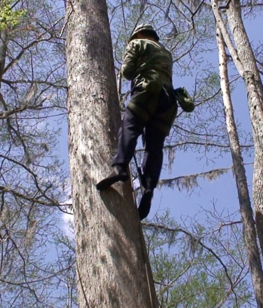 This image shows me in the observation position about 75 feet above the bayou in Tree 6. This image shows me reaching out to clear a small branch out of the way in order to get a reference photo.