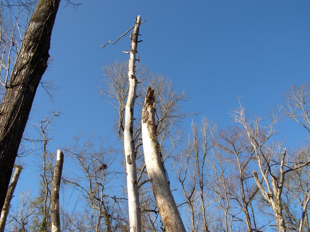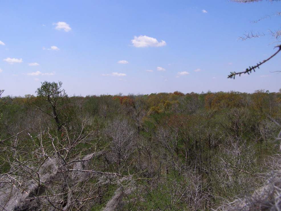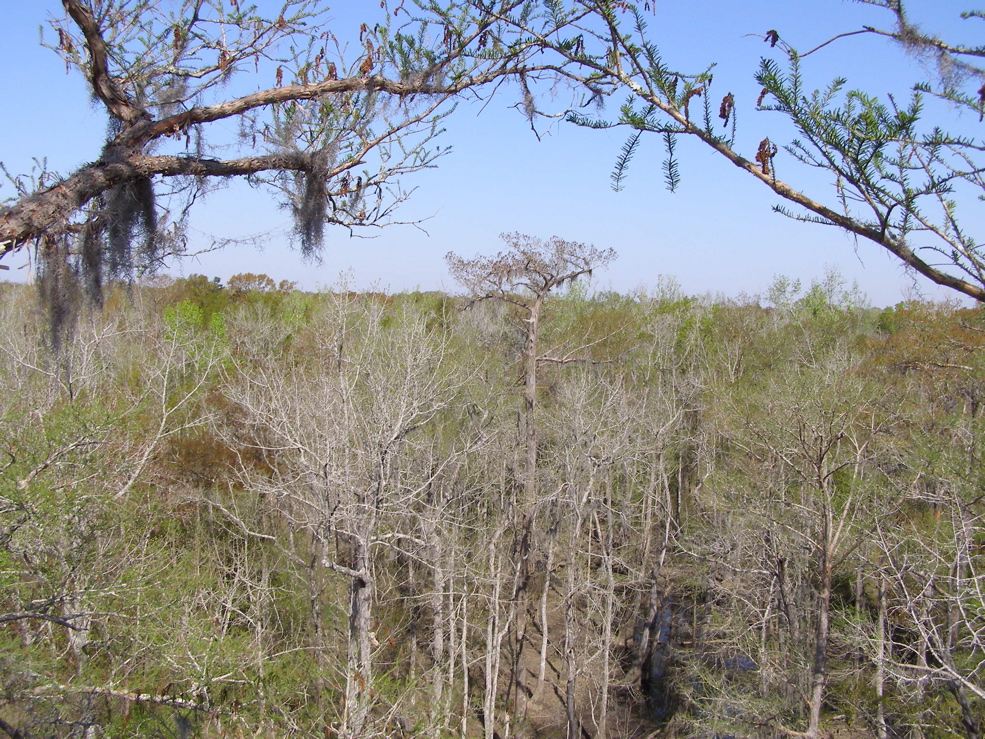 3-29-10. I climbed Tree 8 and visited Tree 6, where I had my last ivorybill sighting exactly two years ago. It was the windiest tree climb I have ever done, and the top of Tree 8 was really swaying. It took about eight minutes to climb up to 87 feet, which is several times faster than when I started climbing in 2007. I had a nice view of the leaves coming out from the top of Tree 8.