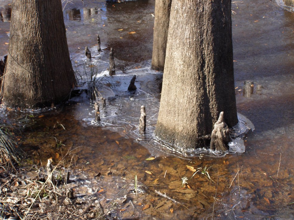 as it melts and the water recedes. One of the dead trees that has been standing since Katrina recently broke apart, leaving two pieces on the ground and about half of it