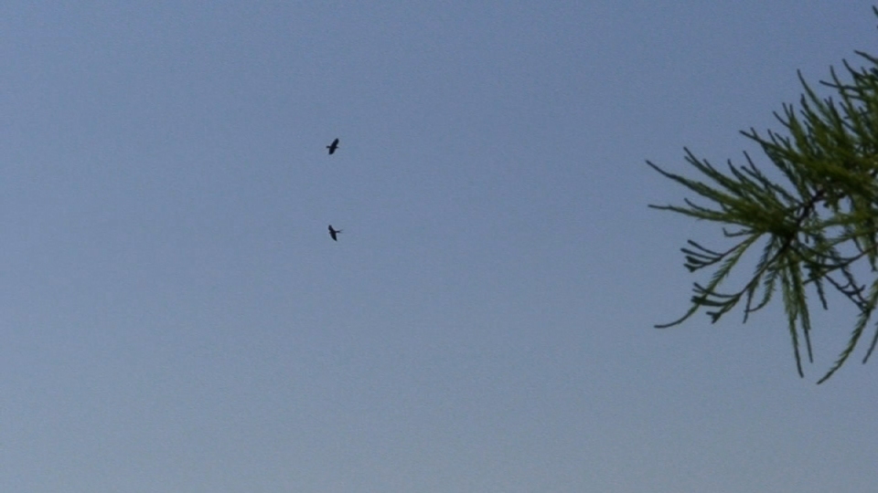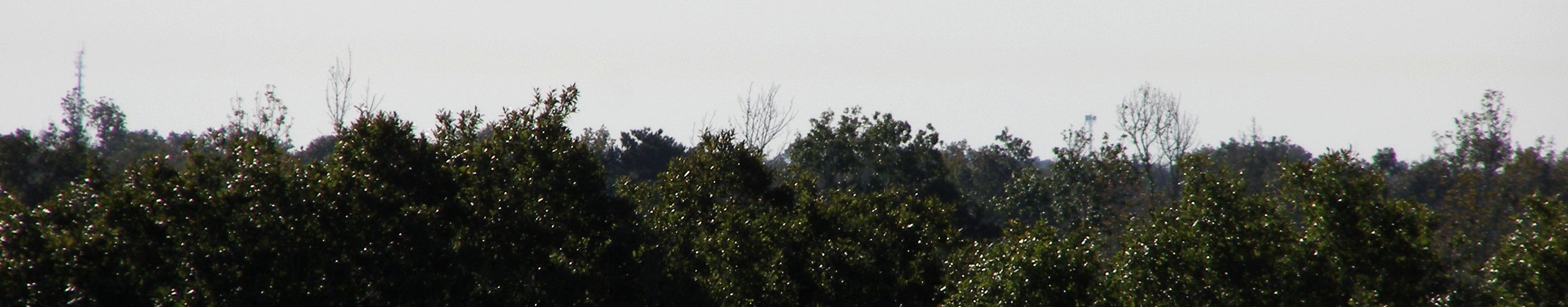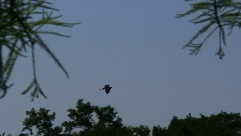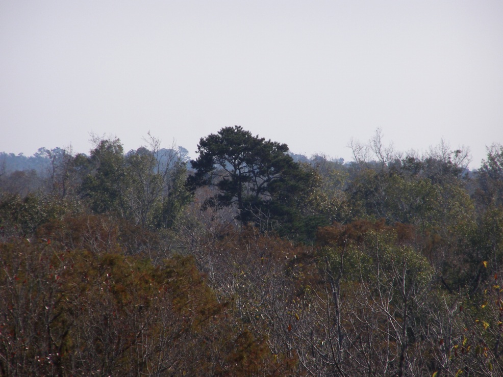flew directly over (the movie plays at half speed). It seemed to be checking me out. This still frame shows it going over. I believe Tree 10 is the large pine on the horizon a little to the left of center in this photo. Yesterday I noticed a big cypress far in the distance to the south, but the bearing isn’t quite right for Tree 5. It must be part of the big grove to the west of Tree 5.