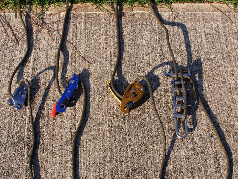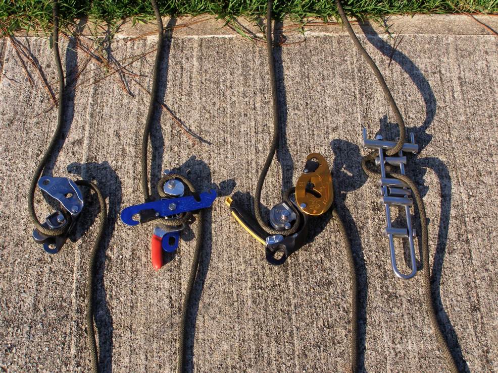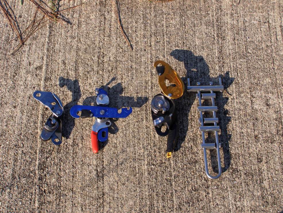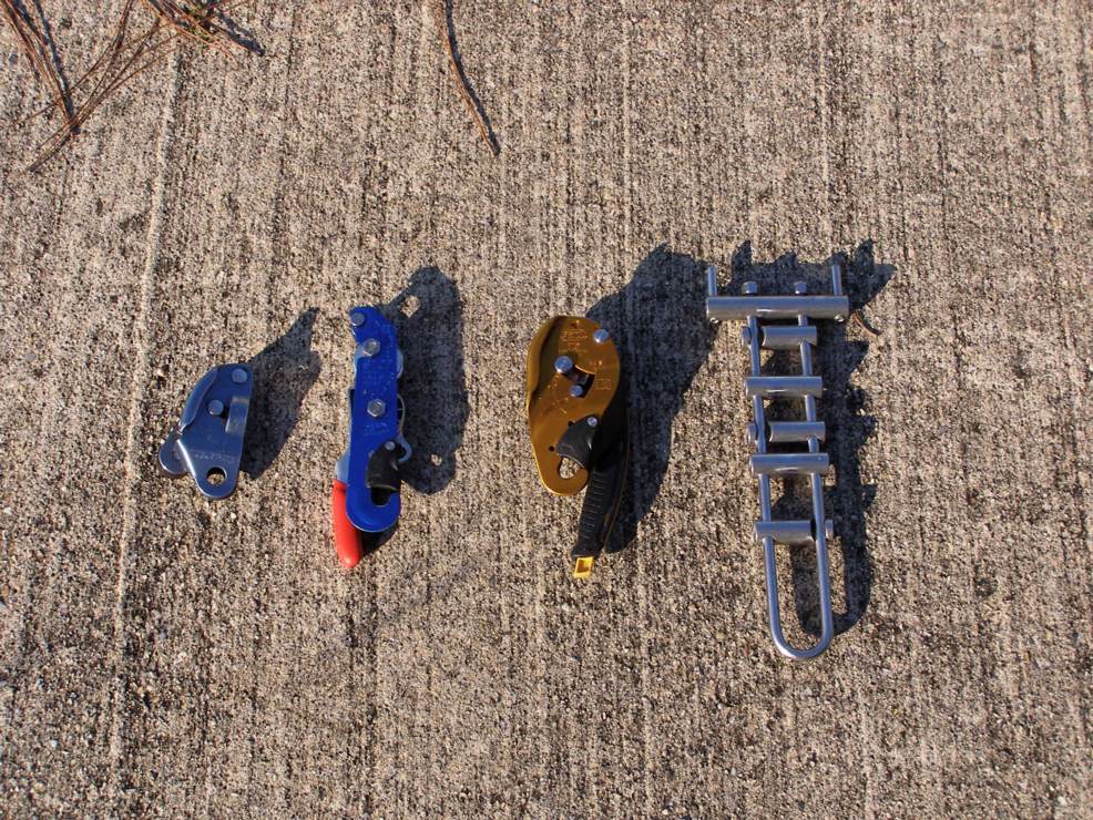 9-16-09. I didn’t visit the swamp this morning, but I did take a few minutes to photograph the descent devices that I have been comparing. In February 2008, I had a scary fall using the Petzl Gri-Gri. It turns out that my 230 pounds plus the weight of a loaded backpack is way too much for that device. I then tried the Petzl STOP, which was a major improvement but still seemed to be a bit overloaded. From left to right in