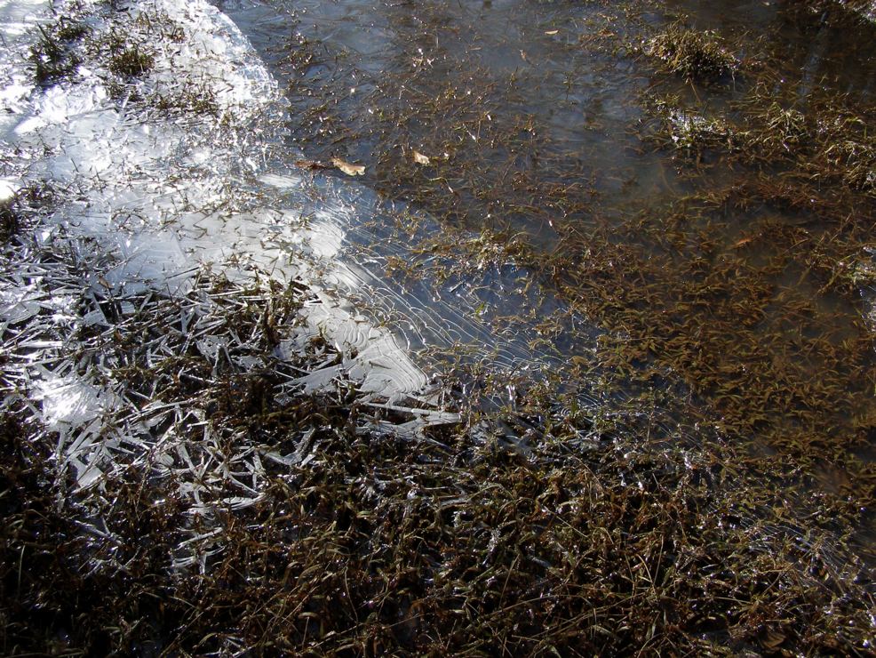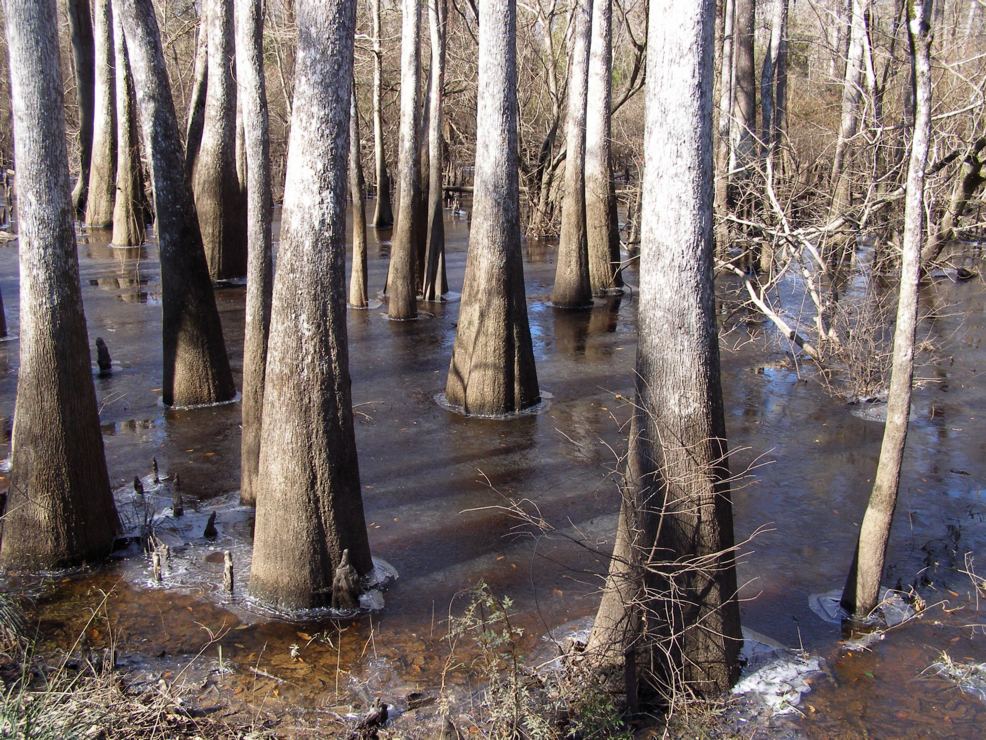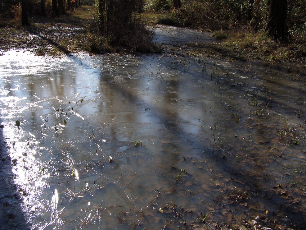 1-10-10. I took a hike in the swamp to verify that the water has receded enough to wade all the way to Tree 8. Along the way, I saw a bayou with extensive ice cover, which is an unusual sight this far south. As the water continued to recede,