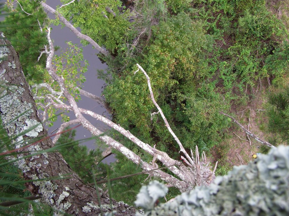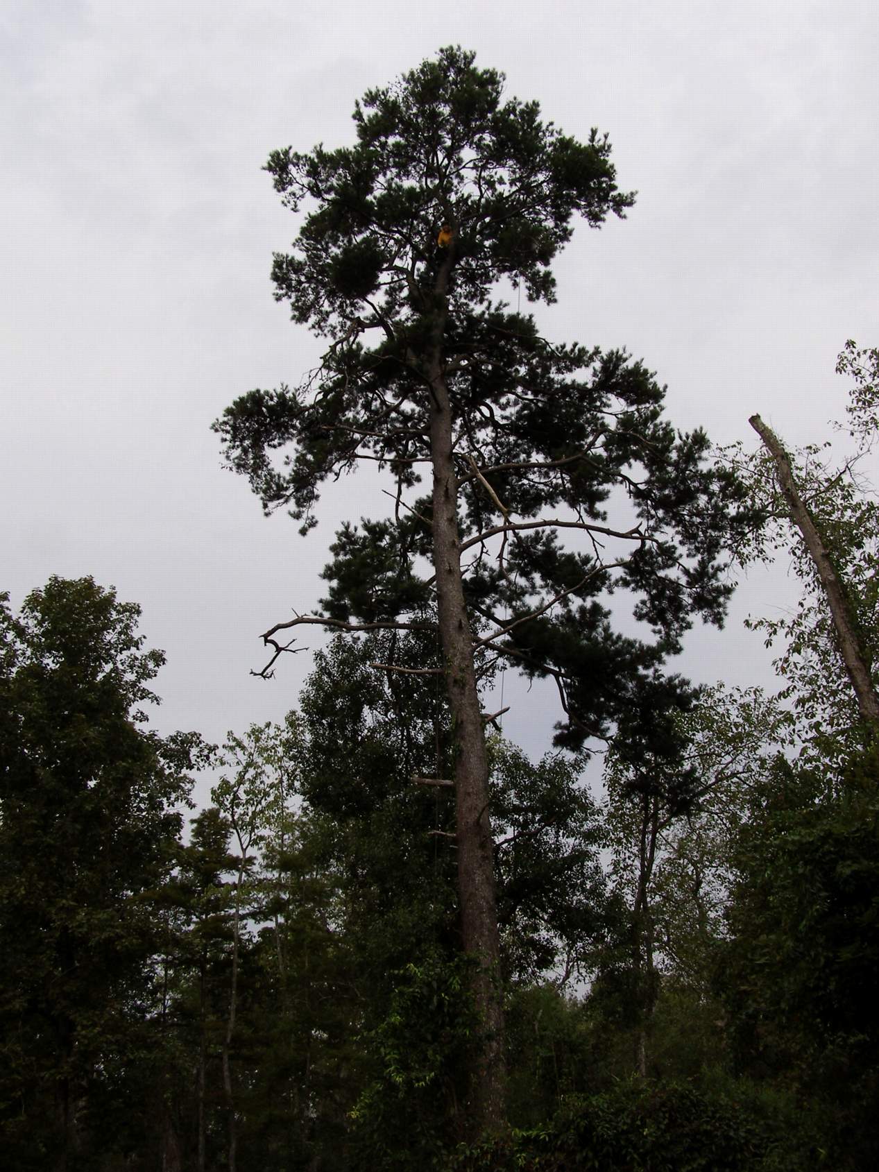 9-6-09. I started rigging Tree 10, which is well located and should provide a nice view. This tree is within 500 m of a 2006 sighting and within 100 m of a 2008 sighting. It appears that it will be possible to rig this tree higher than those that are already rigged in the hardwood zone. Since pines aren’t as strong as cypresses, I’ll have to carefully select an attachment point for the rope.