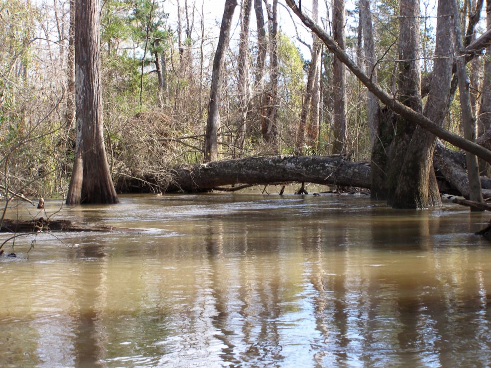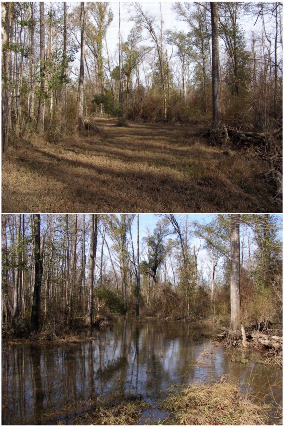 1-8-10. During a hike to Tree 9, I inspected the tree with interesting foraging sign and found that there hasn’t been any further activity. As these photos show, the water has gone way down since last week. The water in the lower photo connects to a bayou that was flooded over its banks.