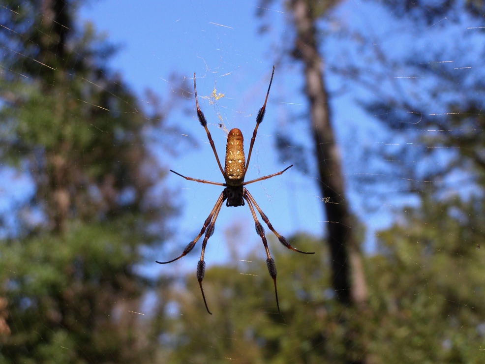 9-30-09. I spent a gorgeous fall morning in Tree 8. There was a nice Northern Harrier flyby just after I got to the top. I was buzzed by a White Ibis, and a Brown Thrasher cast a wary eye on me from a tree nearby. There were lots of migrants in the treetops, including several Gray Catbirds. A cooperative Red-bellied Woodpecker worked on a dead branch nearby. Red-headed and Pileated Woodpeckers were very active throughout the morning. There is frequent woodpecker activity at two impressive dead trees within 500 m, including this one, which has a huge cavity at about 50 feet (not visible in the photo). On the way back, I got a photo of a Golden Orb Weaver.