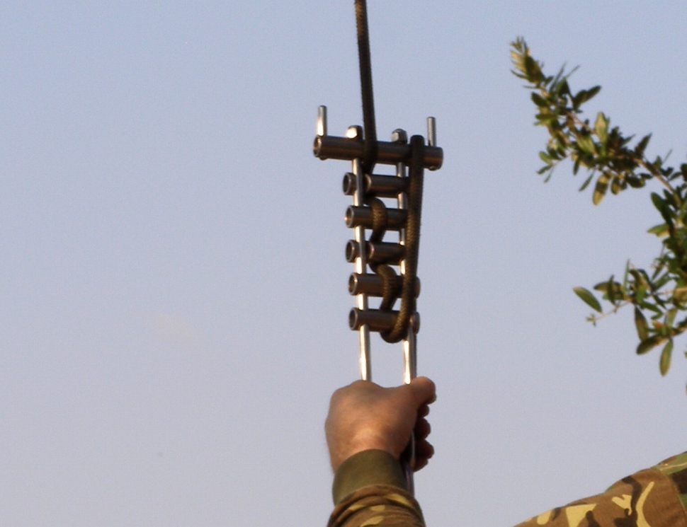 9-3-09. I received two new descent devices and tried them out yesterday afternoon. The Petzl I’D is very smooth, and I absolutely love the BMS six-bar rack. One aspect of the photo of the rack is confusing due to the angle. After looping over the top bar on the right, the rope continues all the way to the ground but is hidden behind the rack. The right hand (not visible in the photo) is used to apply tension to that part of the rope to control the rate of descent. It’s easy to come to a complete stop by applying sufficient tension. I will need to do more testing with a full backpack, but it appears that my problems with descending have been resolved. I will try to get up Tree 8 within the next few days.