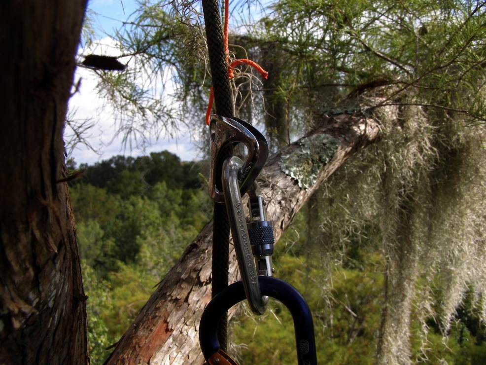 view from up there was very nice. I used the I’D for descending, and it was nice and smooth. On the way up the tree, my backpack (which hangs below on a strap) got hung up on the sharp stub of a broken branch. When I pulled it free, it tore and was left hanging by a thread. I managed to get it before the digital camera and other contents fell about 50 feet.