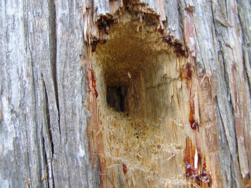 this one, which was found on Tree 6 along with several similar fresh cavities in the same area around the time the 2008 video was obtained. No new cavities of that type have appeared near Tree 6 during the past 18 months despite heavy activity by the other woodpeckers in that area.