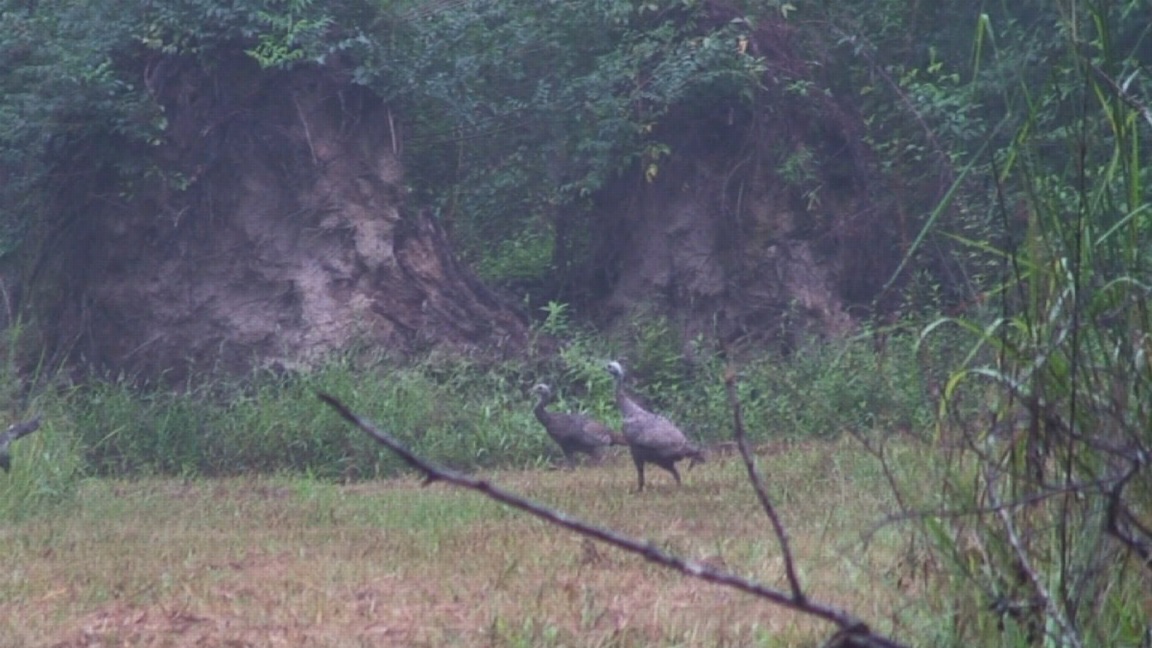 9-7-09. I enjoyed a nice foggy morning in the swamp. I took a walk on one of the trails that was recently mowed and came across turkeys. After doing a stakeout in the vicinity of Tree 6, I tried to reposition the line in Tree 10 and messed it up. I’ll have to shoot it back up there and hope for a better shot.