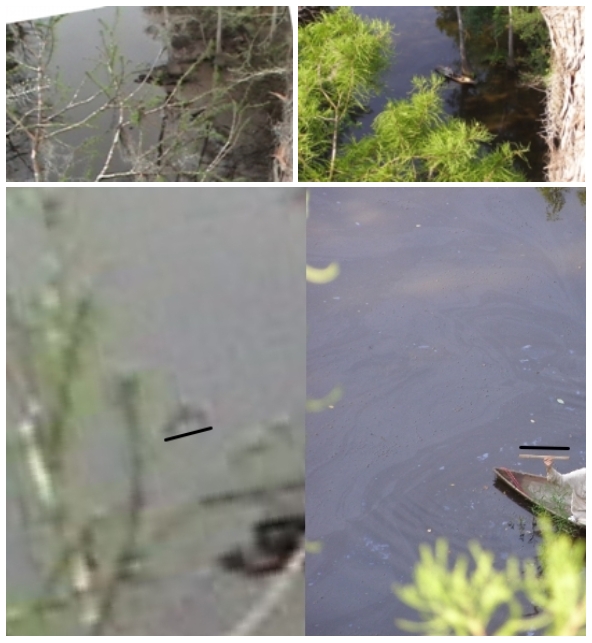 6-2-10. Near Tree 6, the mud along the banks of the bayou is nearly black (almost like sooty ground after a grass fire), and this is why the dark plumage of the bird in the 2008 video is difficult to see. I’ve been aware of the color of the mud for a long time, but I never obtained a good image since the water level and light need to be right. The conditions were right yesterday, and the black mud shows up well in this image.