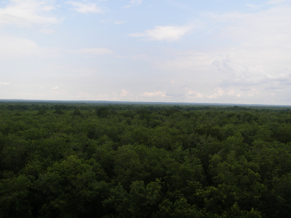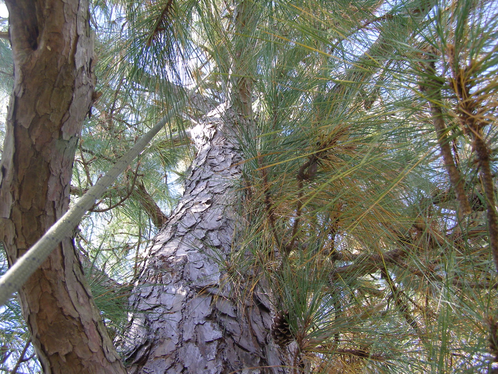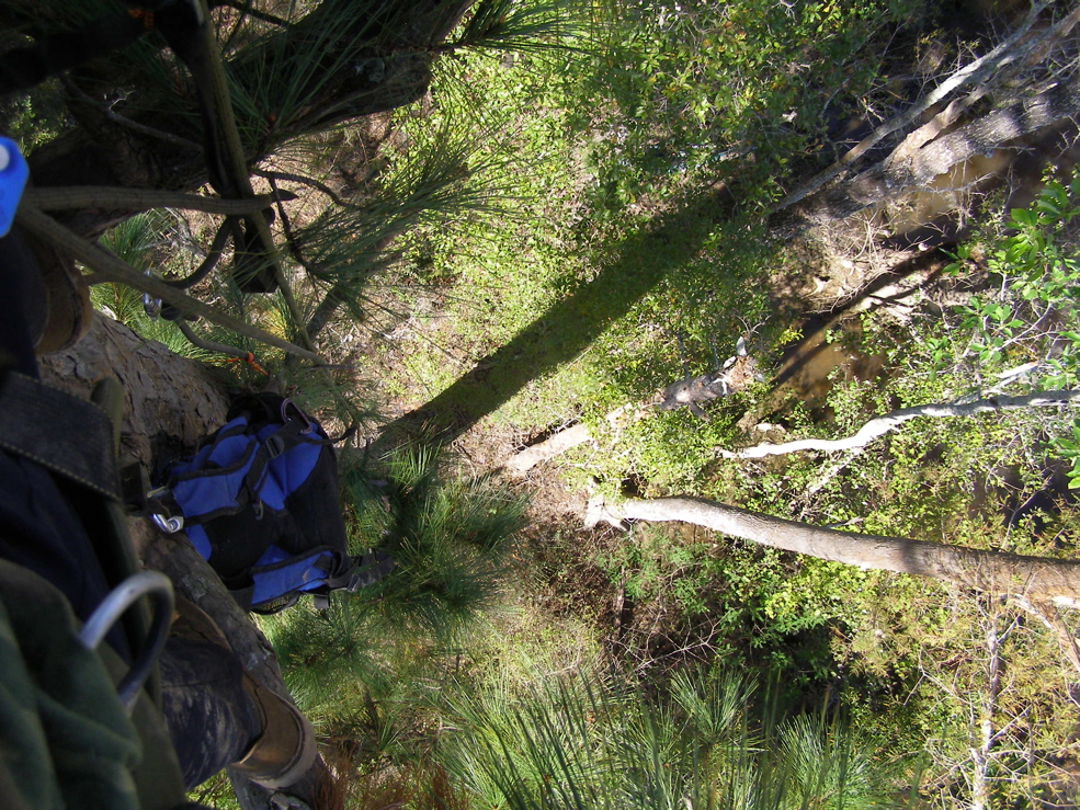 the view to the west was starting to look promising. I still had a good ways to go to the top, where I’m sure the view would be great. The view towards Mike’s River was also looking promising from that height. Looking down was a bit scarier than usual after noticing the problem with the tree. Since pines aren’t as trustworthy as cypresses, I kept a rope around the bole as a backup on the way up. I did have some luck in that the first shot with the arrow got the line in a good place.