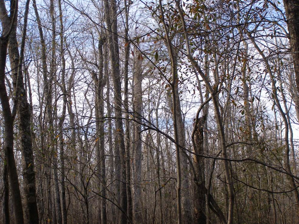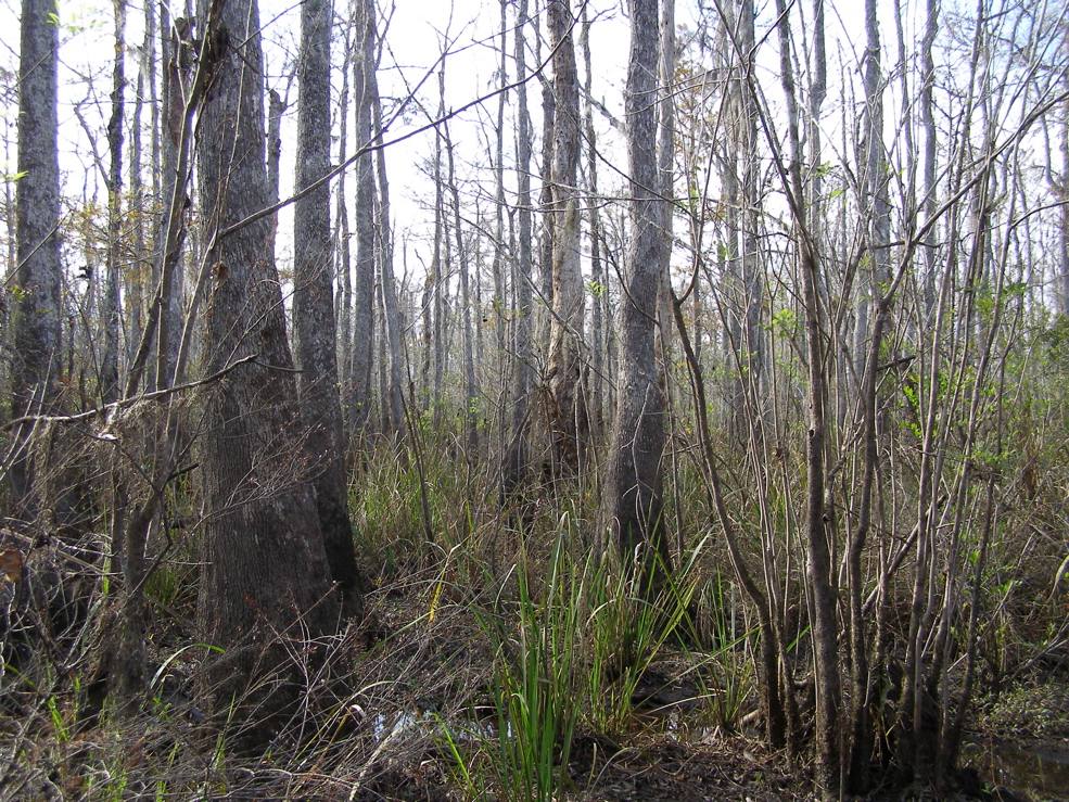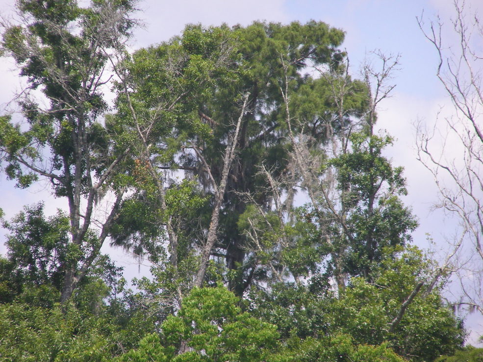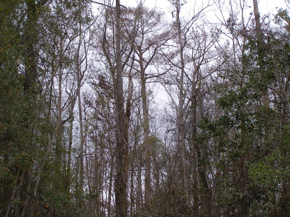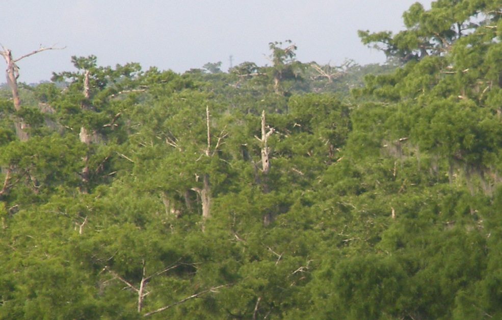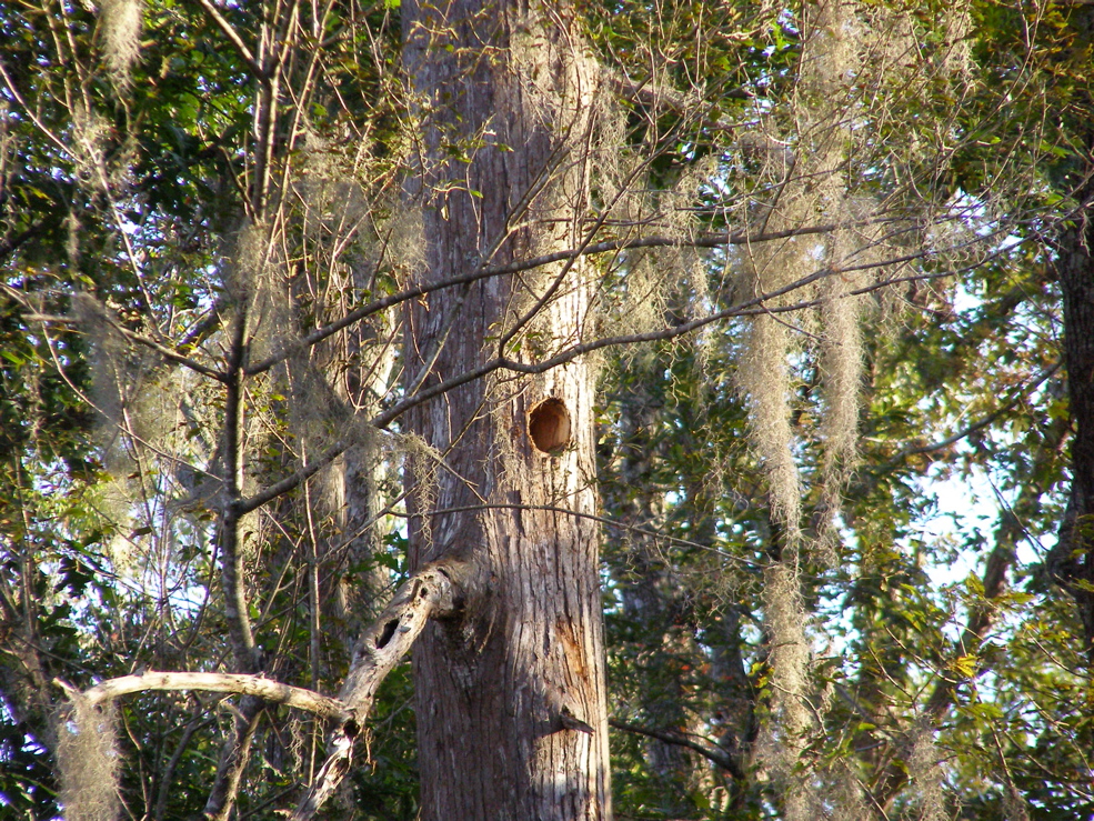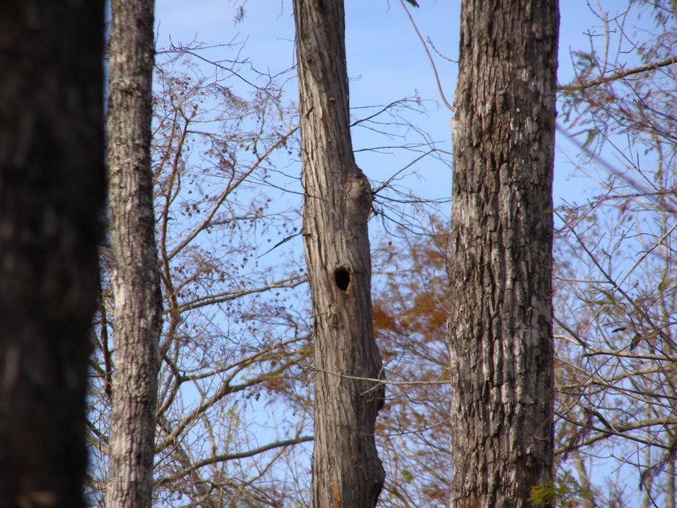 Tree 5 from Tree 3 for the first time. Tree 3 is near the edge of an extensive grove of big cypresses, many of which are over 100 feet tall. It seems that this would be a potential area for ivorybill cavities.
