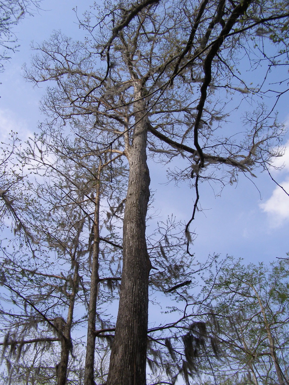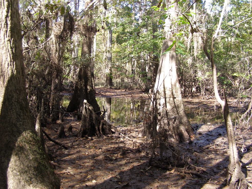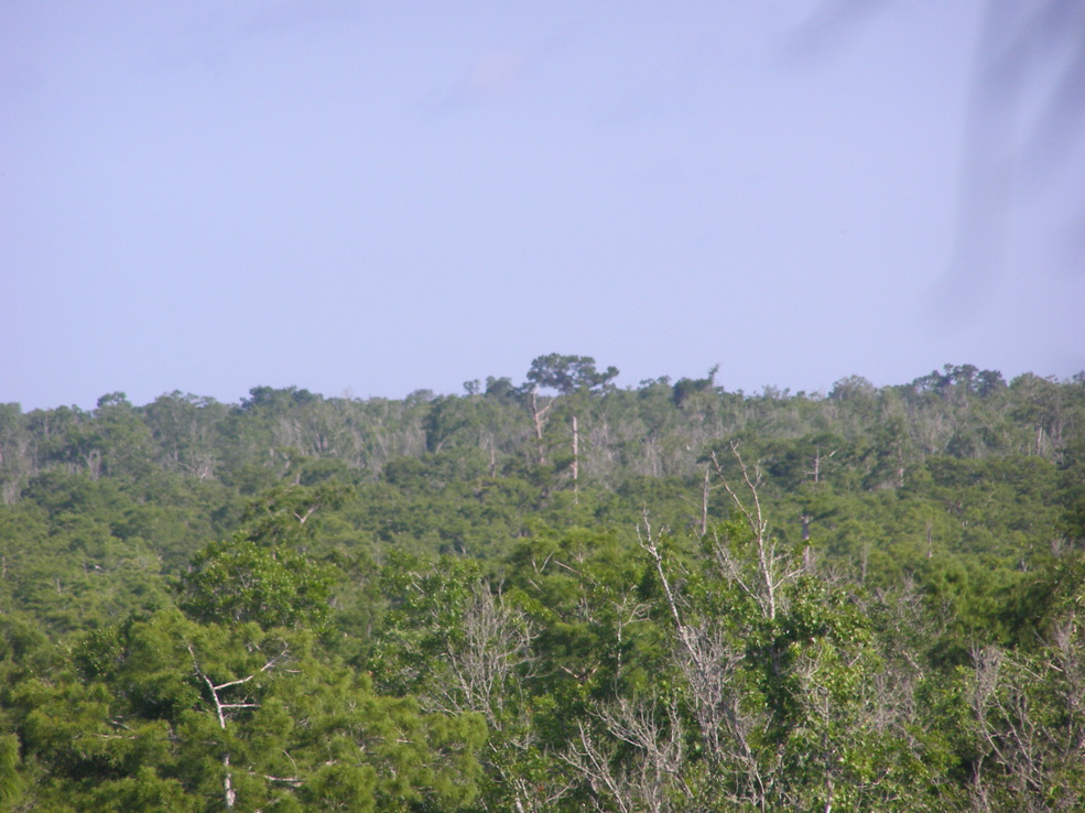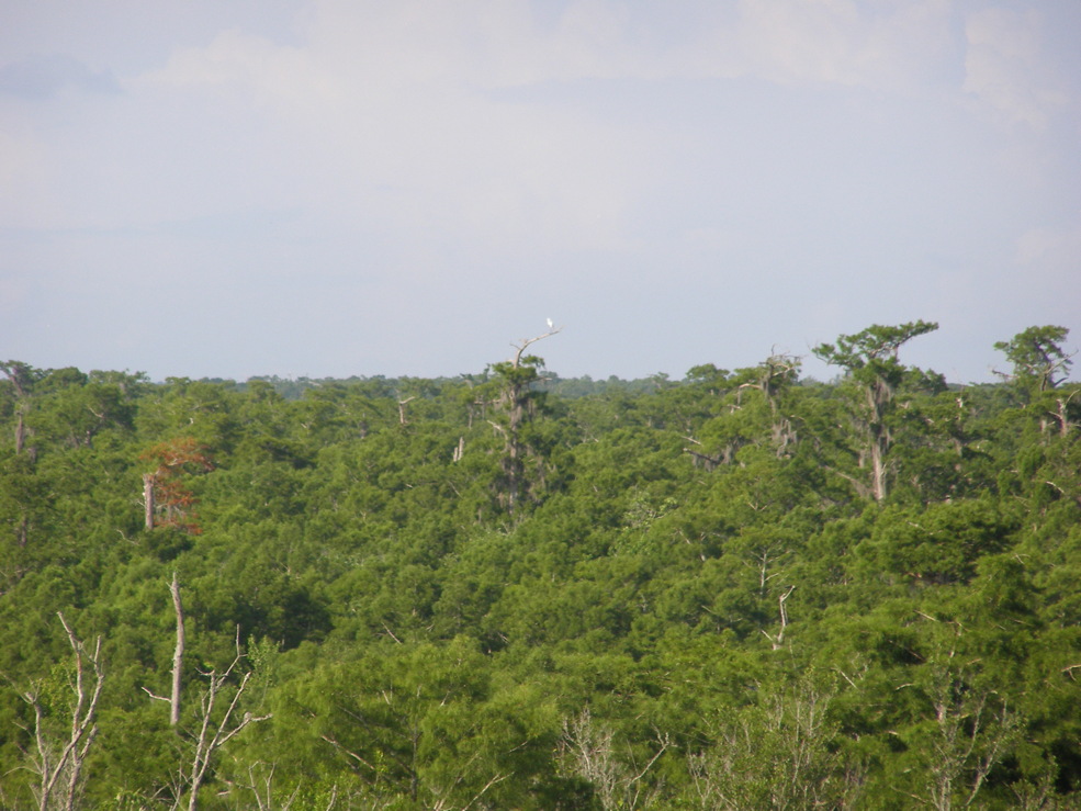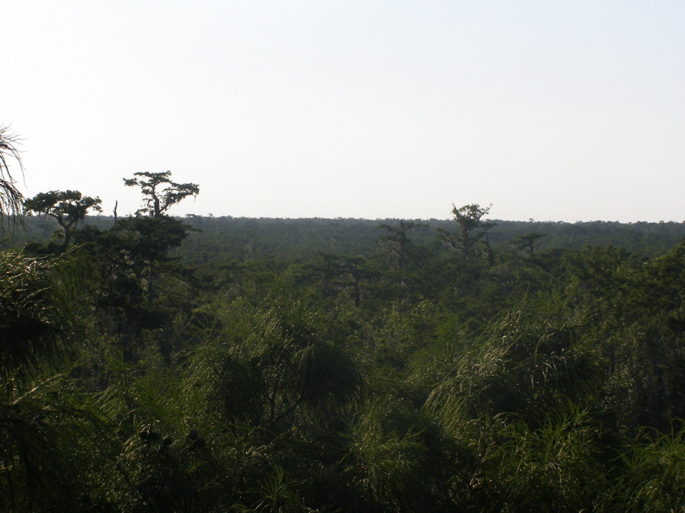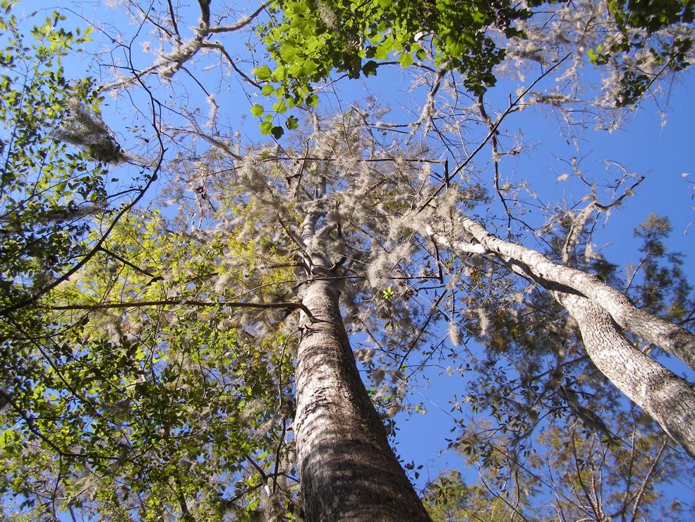 Tree 5 from Tree 3 for the first time. Tree 3 is near the edge of an extensive grove of big cypresses, many of which are over 100 feet tall. It seems that this would be a potential area for ivorybill cavities.