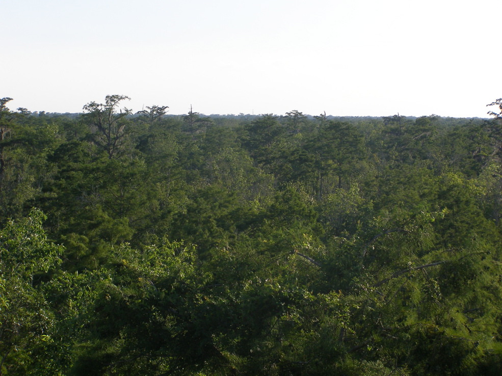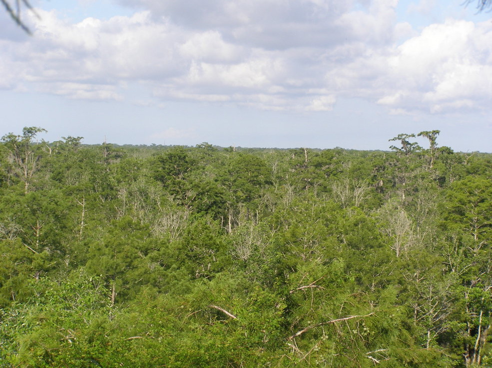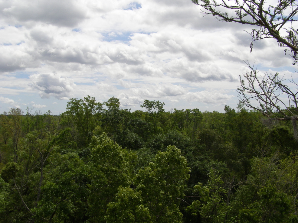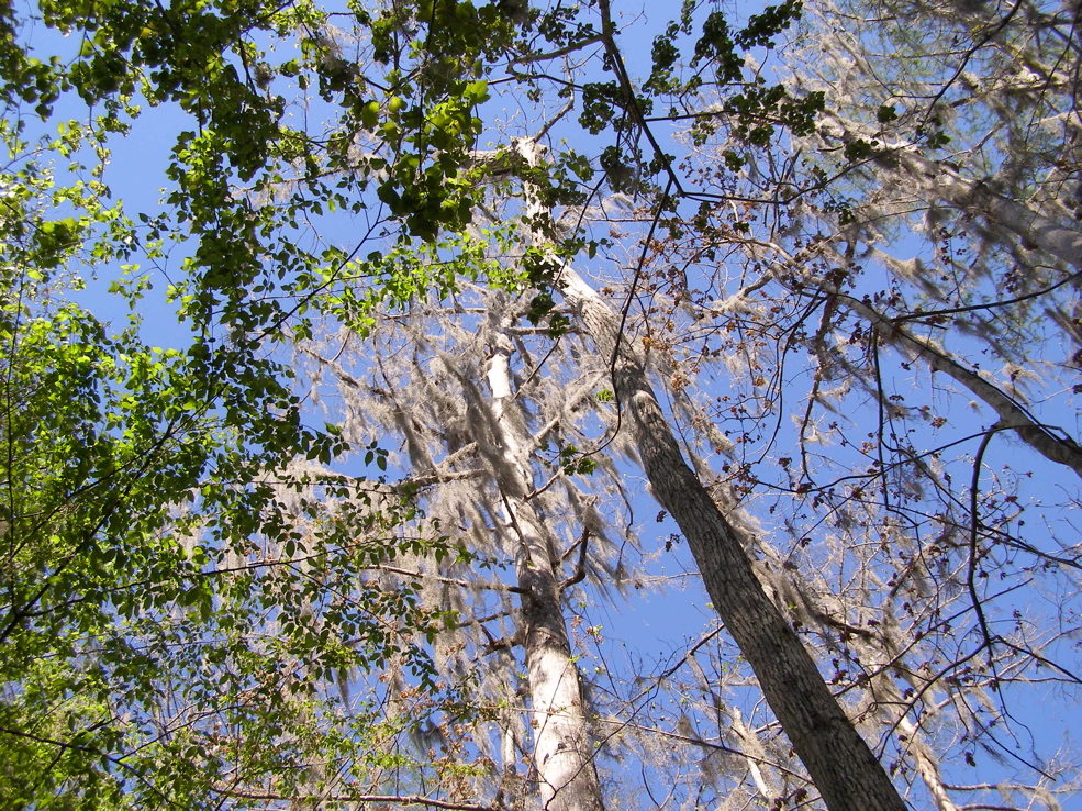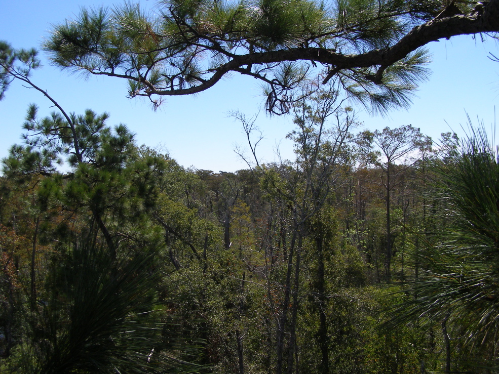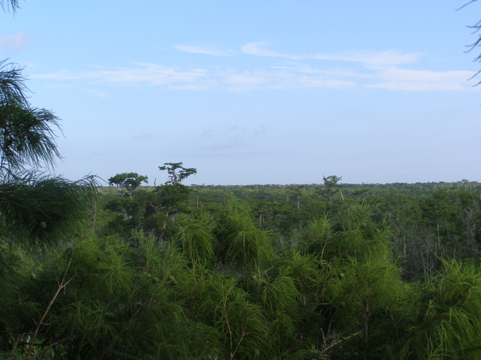 Tree 5 from Tree 3 for the first time. Tree 3 is near the edge of an extensive grove of big cypresses, many of which are over 100 feet tall. It seems that this would be a potential area for ivorybill cavities.