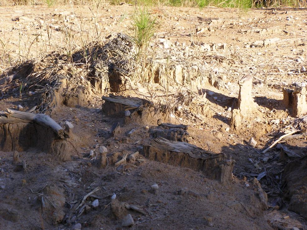 12-8-12. I went for a walk at Stennis in an area where I recently found bobcat prints. I found a spot where rocks and other objects have protected the underlying soil from erosion.