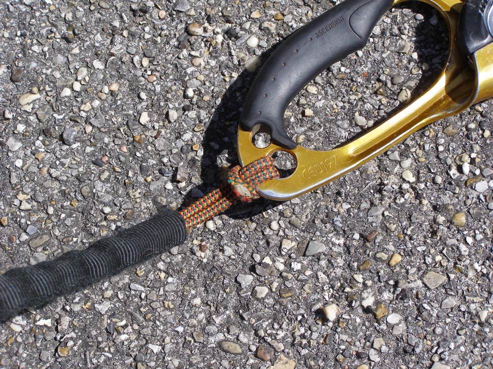 technora line where it attaches to an ascender. The outer covering was worn off,
