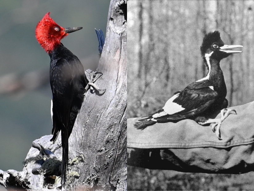 Magellanic Woodpecker. In 2018, I was considering a trip to Patagonia after coming across evidence that Magellanic Woodpeckers might have flights similar to the Ivory-billed Woodpecker. I set aside those plans after being diagnosed with prostate cancer. After retiring in 2025, I got in touch with Valeria Ojeda, who offered to take me to active nests in old-growth lenga forests, where she has been studying Magellanic Woodpeckers for more than twenty years. Just before the trip, my left foot and ankle swelled up. I knew this probably meant there was a blood clot in my leg (it was later diagnosed as an occlusive clot behind the knee), but I wasn’t going to let anything get in the way of this opportunity. A female Magellanic Woodpecker appears in the above photo. A male appears in this photo. At one of the nests, I obtained video footage of magnificent swooping flights similar to upward swooping landings with long vertical ascents that appear in video footage that was obtained during an encounter with a pair of Ivory-billed Woodpeckers in Florida in 2007. One of the flights (Movie S12 here) is exactly as depicted in this illustration, with a long vertical ascent, rotation about the axis, and landing on a surface that does not face the direction of approach. From directly below a nest, I obtained a photo (click here for high-resolution version) that shows that the Magellanic Woodpecker has wing and tail proportions similar to those of the Ivory-billed Woodpecker: (1) the distance the tail projects behind the trailing edge of the wings is about the same as the distance between the leading and trailing edges of the wings and (2) the width of the body is a substantial fraction of the distance between the leading and trailing edges of the wings. In this comparison, note the similarities in the feet and crests (Tanner took the photo of the nestling Ivory-billed Woodpecker, which was later determined to be a male). The videos captured various types of flight, other behaviors, two types of wing noise, and many double knocks. Some of this material is available for download here. From one of the nest sites, I had a nice view of Mt. Tronador. During my visit to Bariloche, Facundo Vital took me to a massive rock face that is pockmarked with caves where Andean Condors roost.