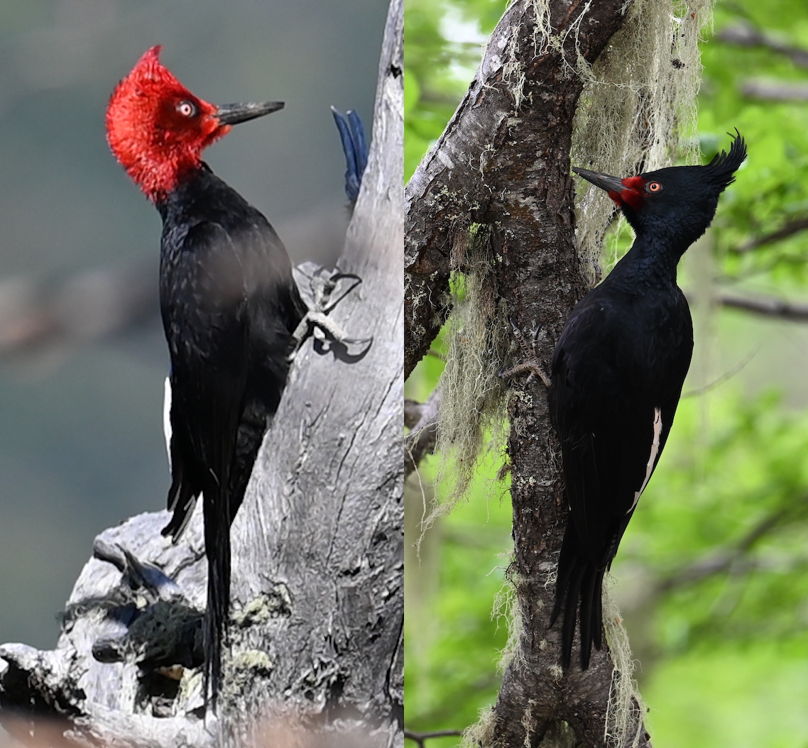 11-12-25. Valeria took me to a nest in Valle Challhuaco, where I obtained photos and video footage of Magellanic Woodpeckers. In these photos, a male appears on the left and a female appears on the right. The forest around the nest tree was somewhat open, which offered clear views from a distance. My strategy was to place a 4K video camera on a tripod at distances of several tens of meters from the nest tree, set the lens to wide angle, and record continuously. With this approach, I was hoping to get footage of substantial portions of flights as the birds made trips to and from the nest.