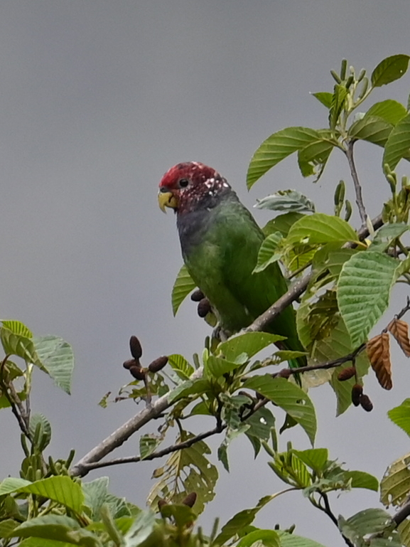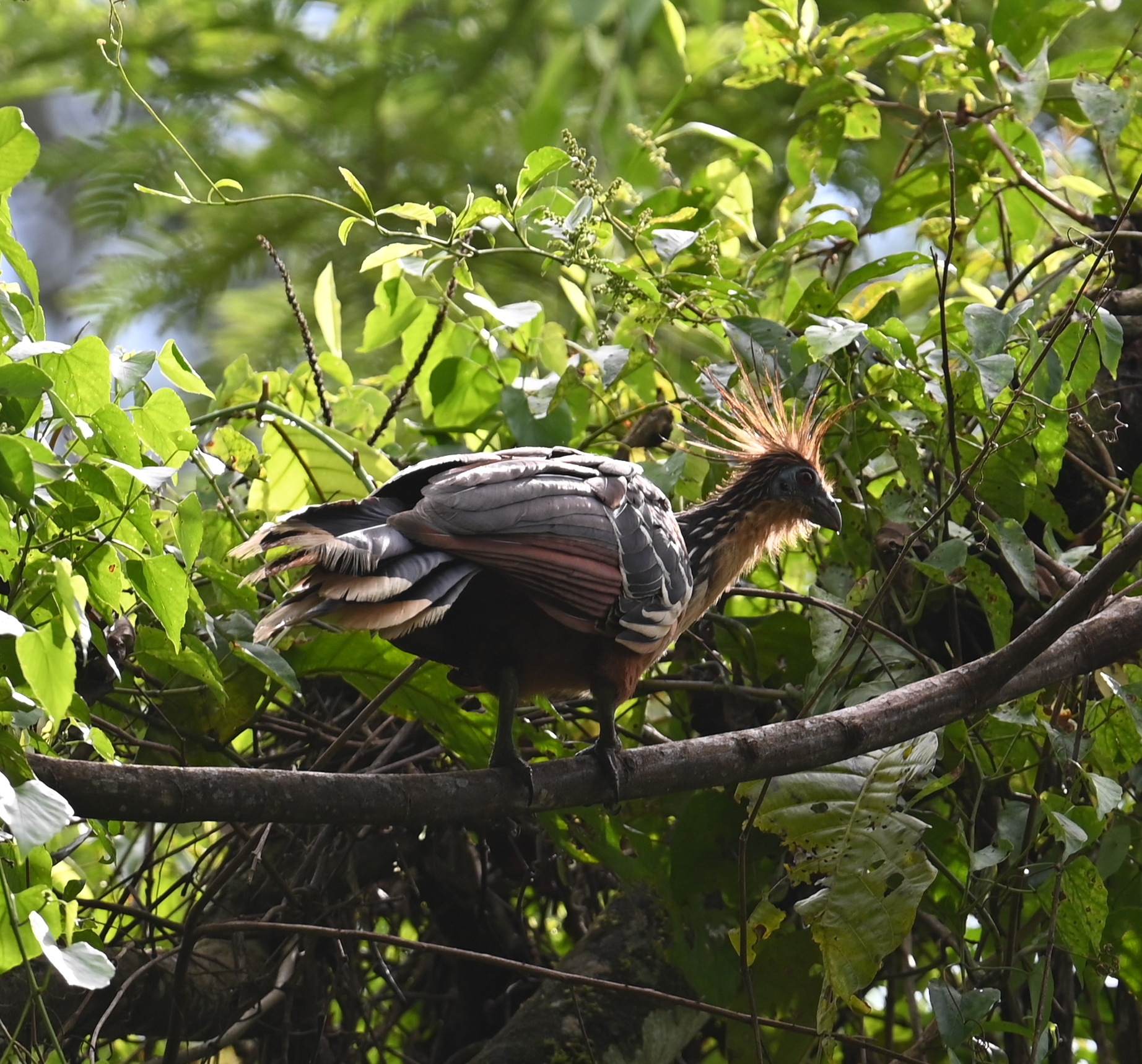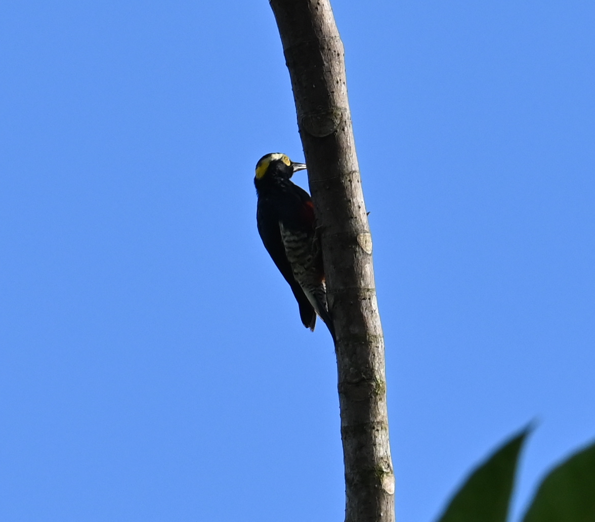 Lowland Forest. One of my goals in the lowland forest was to obtain photos and video footage of the Crimson-crested Woodpecker. I frequently heard the knocks of this species and had occasional sightings from a distance. On my last day, I came upon a perched Crimson-crested Woodpecker in good light at close range. I obtained photos and video footage, but the photos didn’t look right in the previewer on the camera. I hurried back to the lodge, downloaded the photos, and discovered that the ISO had somehow gotten set to a very high value. I returned to the site in hopes that the woodpecker would return. By a stroke of luck, it came back immediately after I arrived, and I obtained the above photo (here is a higher-quality copy). I also obtained a photo of a female Crimson-crested Woodpecker. Right after I obtained that photo, the male glided over me in a swooping flight that brought to mind the Ivory-billed Woodpecker. Some Campephilus woodpeckers signal with double knocks. The Crimson-crested Woodpecker and a few others signal with more than two knocks, but they produce such signals with only one thrust of the body. As discussed here, this behavior may be modeled in terms of a harmonic oscillator, with multiple knocks corresponding to a series of bounces. I obtained this footage of the Crimson-crested Woodpecker delivering a blow that produced multiple knocks. I saw and heard many other species in the lowland forest, including Gray-fronted Dove, Yellow-tufted Woodpecker, White-lined Antbird, Pale-winged Trumpeter, Thrush-like Wren, Hoatzin, Russet-backed Oropendola, Black-fronted Nunbird, Violaceous Jay, Goeldi’s Antbird, Masked Crimson Tanager, Collared Aracari, Great Horned Owl, and Bluish-slate Antshrike. I also obtained photos of Collared Peccaries, a cayman, cacao, a beautiful butterfly that seemed to be attracted to the salt on my sweaty shirt, and another butterfly. I took a boat up the river to do some drone flights and obtained this photo of pristine habitat on the opposite side of the mountain from Amazonia Lodge. I flew the drone over the mountain from the lodge to obtain this photo, which shows Pilcopata on the left and pristine habitat on the right. This photo shows the view in another direction from above the mountain. This photo shows the view looking down Rio Madre de Dios from above Amazonia Lodge. This photo shows Amazonia Lodge from above. During a flight near the lodge, the drone was attacked by a flock of Cobalt-winged Parakeets.