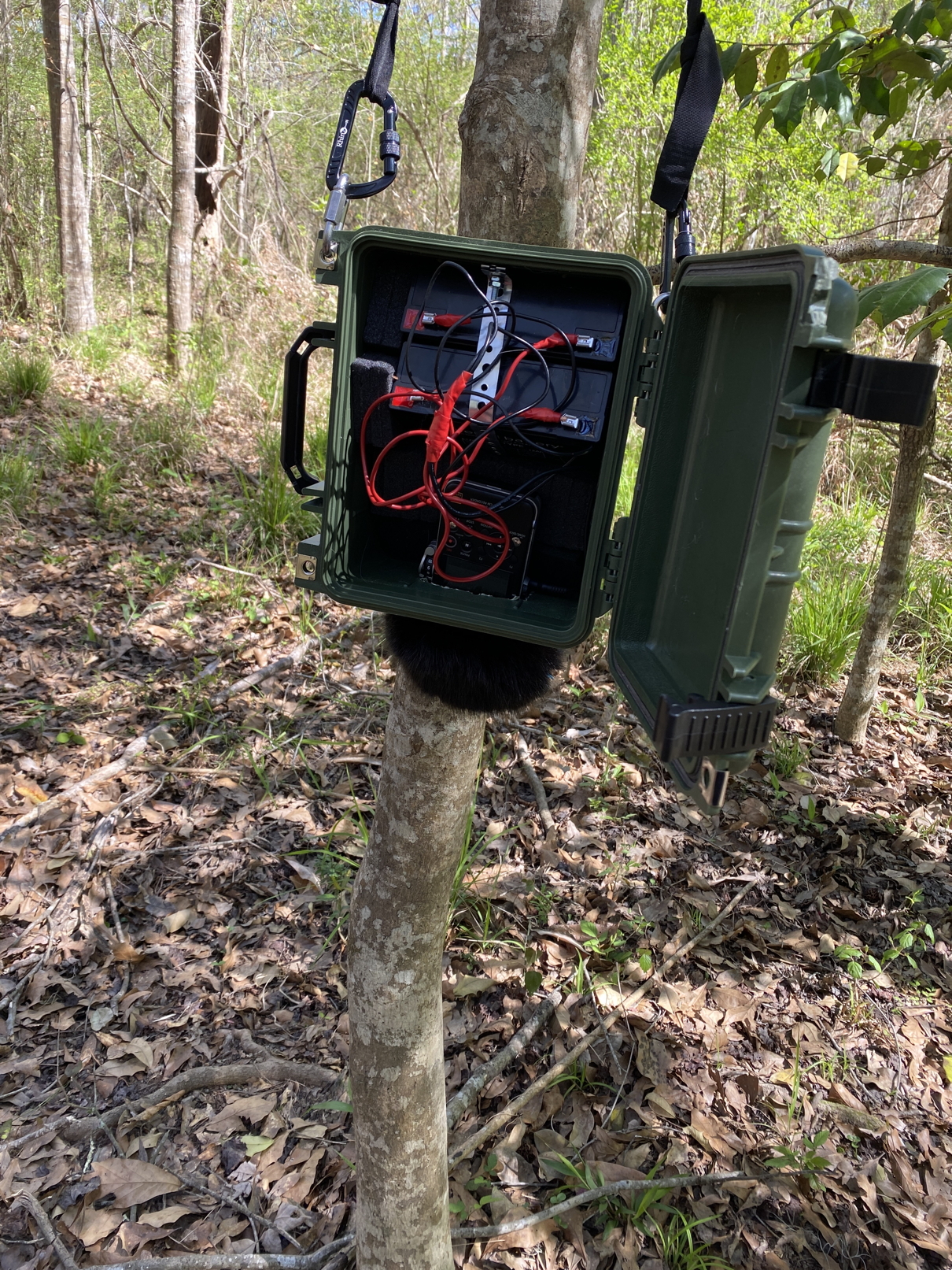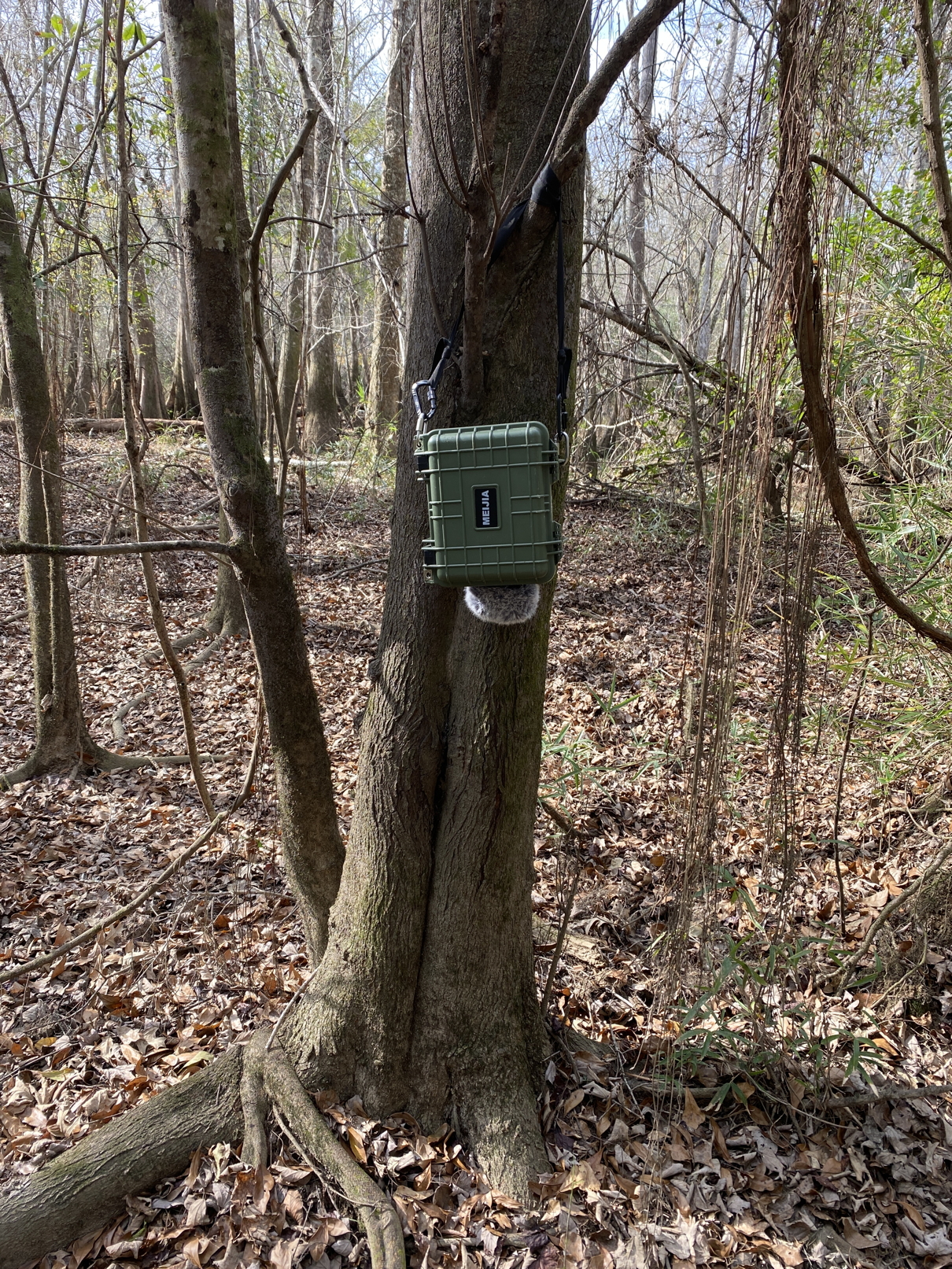 3-5-23. I have returned to the Pearl for a brief visit. I was in the area a few weeks ago, but the water was too high to do anything. I kayaked out to an area where I heard a double knock two years ago and deployed a Sony PCM-D100 audio recorder, which produces high-quality audio recordings. I rigged up an external battery so it will record for several days. As illustrated here, I installed it in a Pelican case with the microphones aimed downward in order to keep it dry. I took this photo of Tree 6, which Dalcio Dacol named Supernova Cypress. I had an interesting sighting in the general area where I had sightings of Ivory-billed Woodpeckers years ago. I saw and heard rapid wingbeats, dark plumage, and a flash of red on the head. I didn’t see any white. If it was an Ivory-billed Woodpecker, I could have missed the white due to the edge-on view of the wings. The video camera captured the wing sounds but no images.