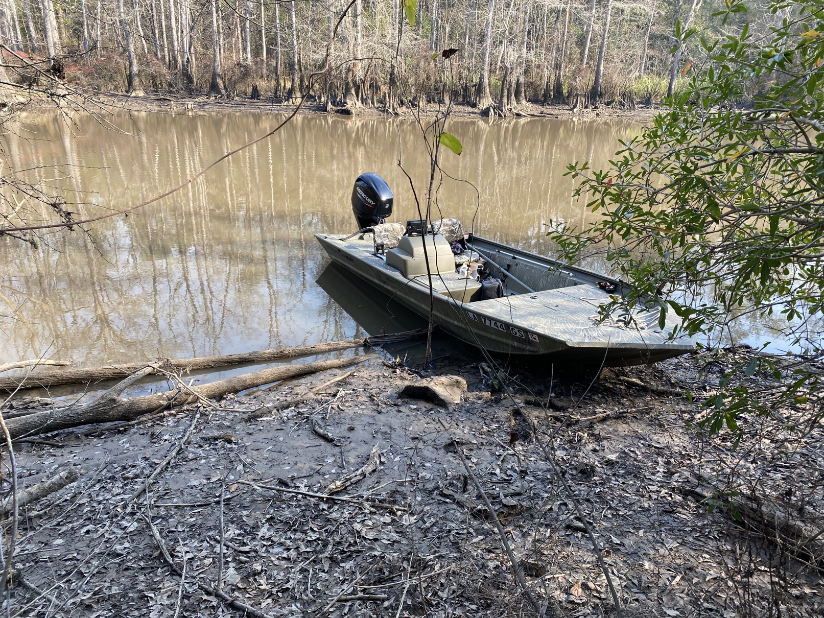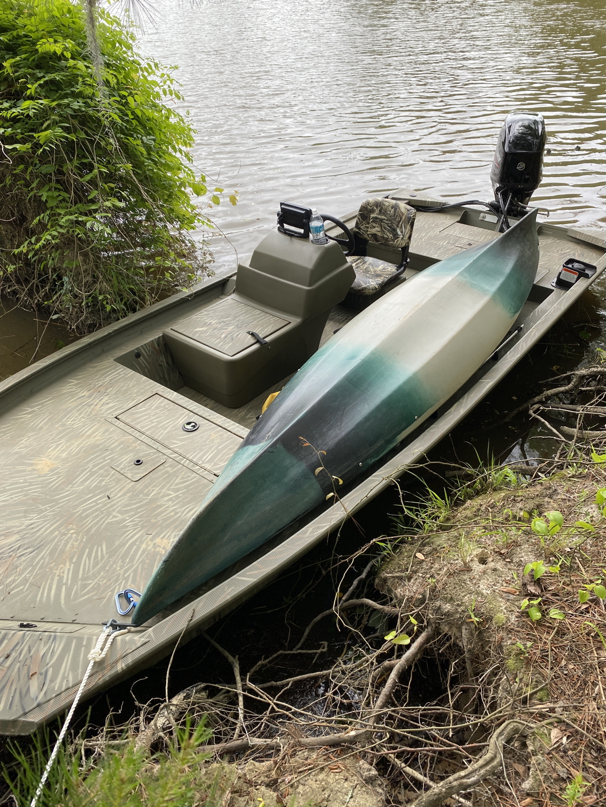 4-19-25. I took the boat out in the Pearl with the kayak onboard. I stopped at the mouth of English Bayou. Still learning to operate the boat, I used the kayak to go up the bayou, which has lots of obstacles.
