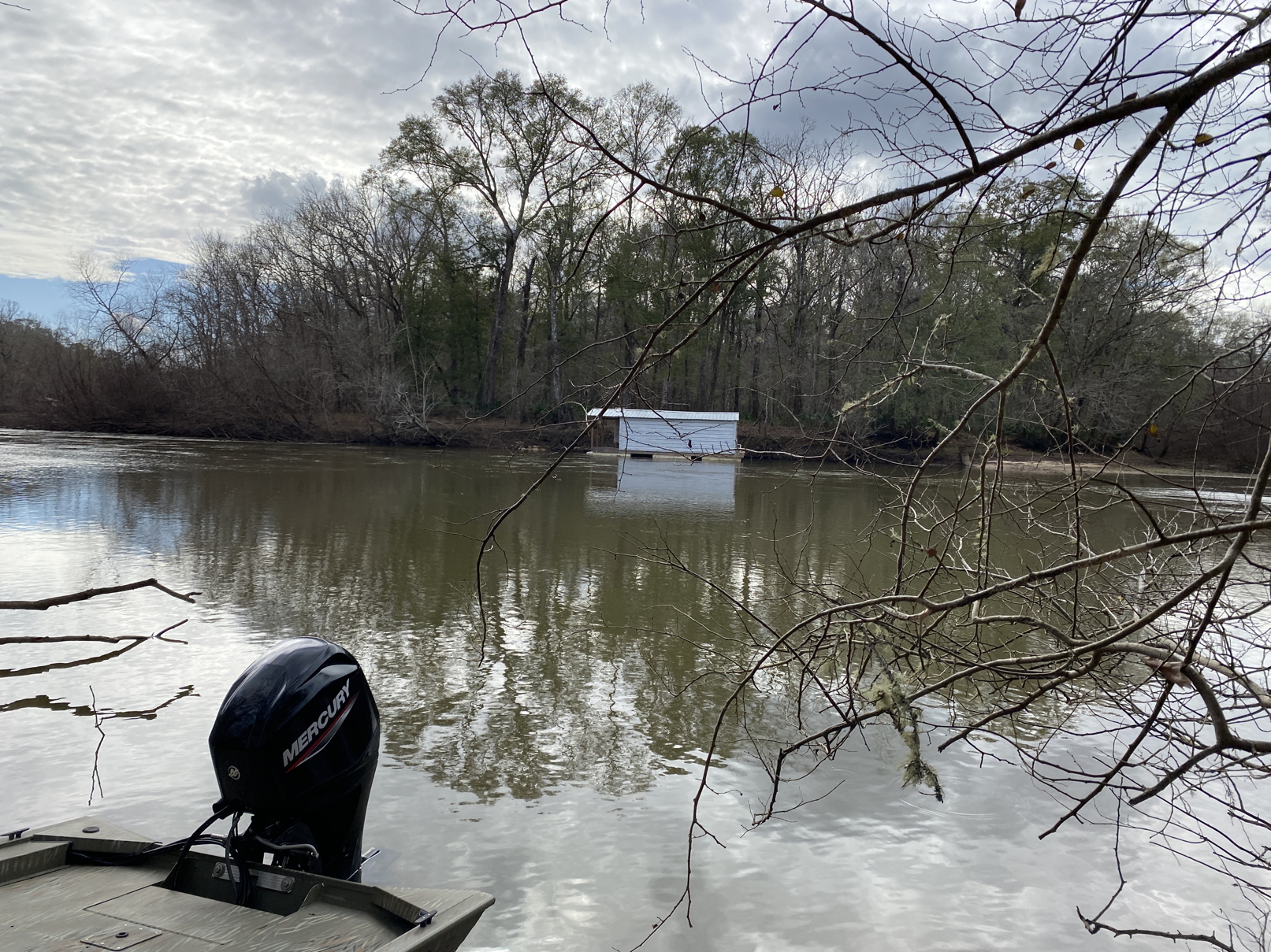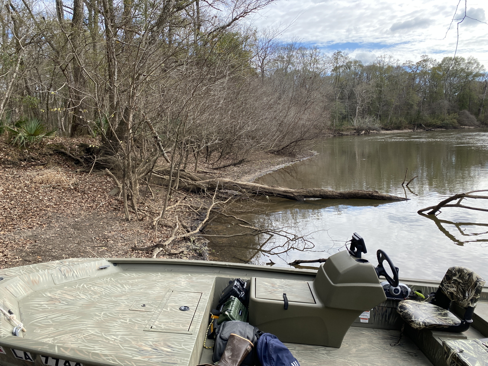 1-23-26. I just returned from a trip to areas in Louisiana and Florida where I had sightings in 2006 and 2007. Low water levels made it a challenge to navigate the boat past obstacles in the Pearl and the Choctawhatchee. The habitat still looks good in the Choctawhatchee, but numerous hunting camp houseboats have sprung up along the stretch where there were several Ivory-billed Woodpeckers sightings between 2005 and 2007. In some cases, there are outdoor grills and other items on the land near the houseboats. In the Pearl, I deployed three audio recorders for eight days (for a total of 24 days of data) and captured a possible double knock, what seems to be a bobcat meowing, and a medley of sounds.