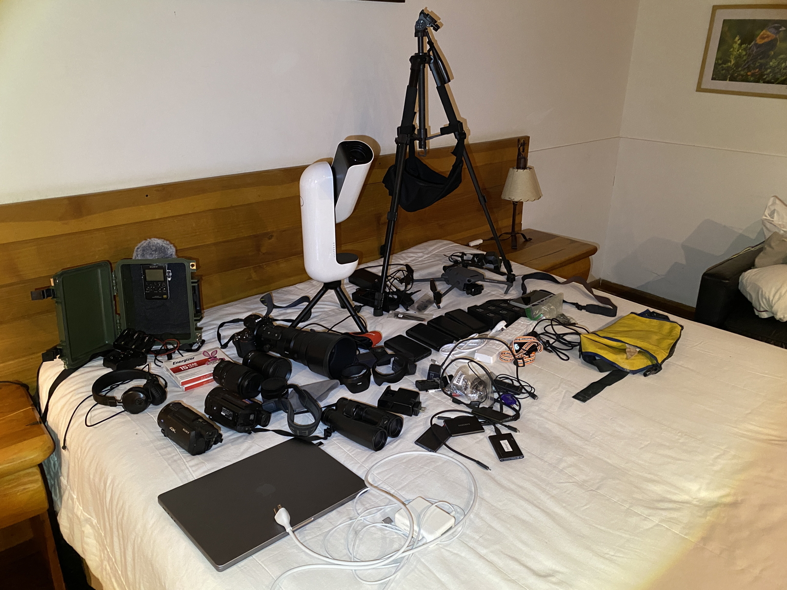 11-11-25. I arrived in Bariloche after an 18.5 hour drive from Buenos Aires. I was traveling with a large load of fragile and valuable equipment (everything in this photo except the tripod and Pelican case) in my carry-on luggage, which was probably too much for a domestic flight. It was worth the long drive to ensure that everything arrived safely (losing equipment would have put the objectives of the trip in jeopardy).