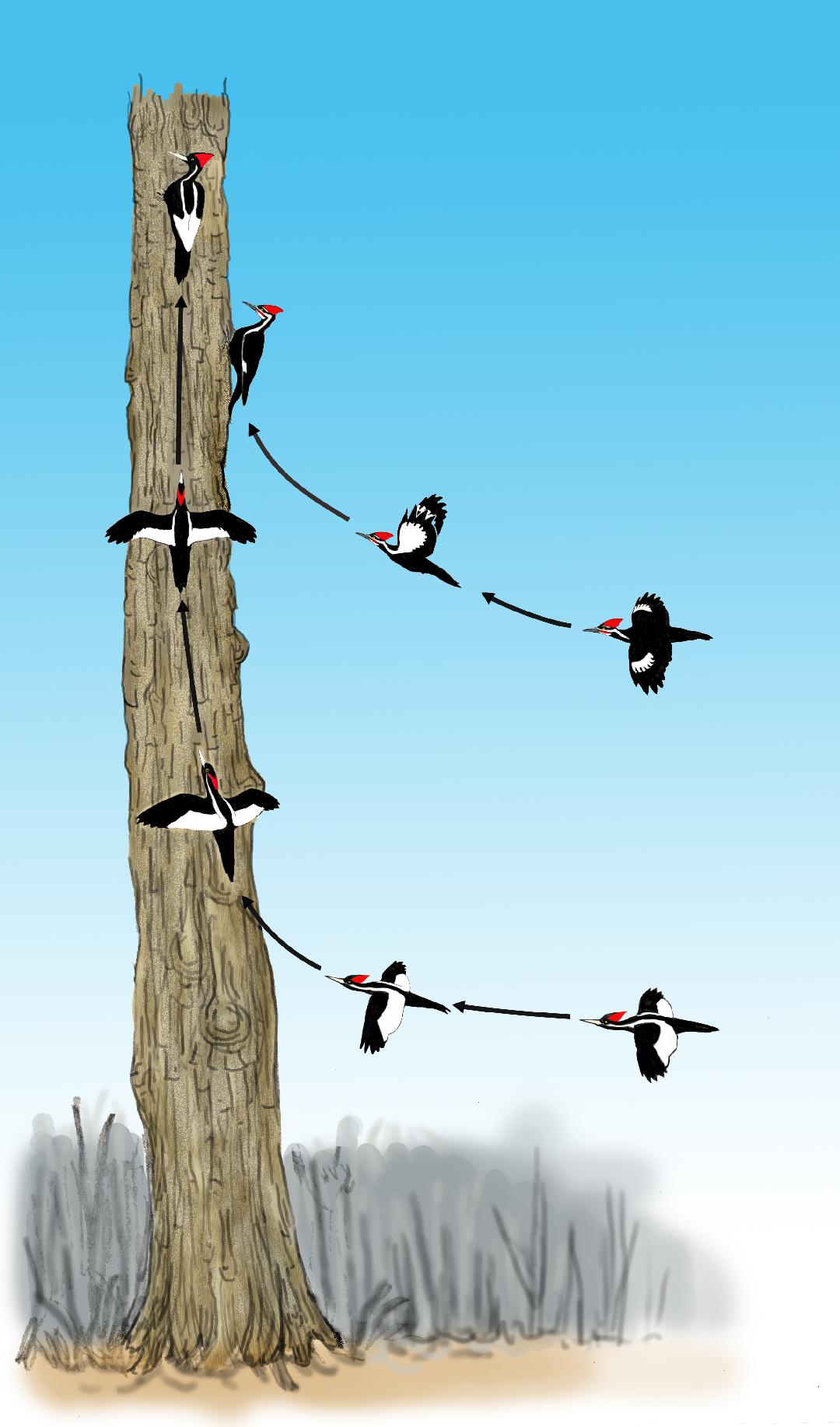 11-14-25. After visiting a nest at another site the previous day, I returned to the nest in Valle Challlhuaco and observed a Magellanic Woodpecker come in with a magnificent upward swooping landing (Eckelberry used the same words to describe a landing by an Ivory-billed Woodpecker in 1944) that was identical to the flight by an Ivory-billed Woodpecker in this illustration. Seeing (and hearing) that flight was every bit as exciting as any of my ten Ivory-billed Woodpecker sightings. I wasn’t sure if the camera had picked it up. Was the flight path blocked by a tree at a critical point? Fortunately, the full flight path was captured in the video (this version was cropped from the original). Note the sounds from the wings as the bird glides in before the landing. As in the illustration, the bird rotates about its axis during a long vertical ascent and lands on a surface that doesn’t face the direction of approach. During an encounter with a pair of Ivory-billed Woodpeckers in Florida in 2007, I observed several magnificent upward swooping landings and captured some of them with a high-definition video camera. During two of those landings, the bird rotates about its axis and lands on a surface that doesn’t face the direction of approach (as in the illustration). This is a clear match with a remarkable behavior of a closely-related Campephilus woodpecker that cannot be explained in terms of anything other than the Ivory-billed Woodpecker. As shown in the illustration, the Pileated Woodpecker typically swoops upward a short distance and lands on a surface that faces the direction of approach. During an upward swooping landing, kinetic energy is converted to potential energy. A long vertical ascent requires a high kinetic energy, which corresponds to a high flight speed. The Pileated Woodpecker, which has a relatively low flight speed, is not capable of the upward swooping landings with long vertical ascents that appear in the 2007 video. Just after landing, there is still some upward momentum, and the bird takes a few small steps upward. This is similar to a man stepping off a moving streetcar and taking a few quick steps before stopping. Note that the bird flies in to the left of the tree (rather than directly toward it), which sets up the landing on that side of the trunk. During the approach on this type of flight path, tree branches that could be dangerous obstacles along the ascent path would be relatively easy to see (sticking out to the side). In this image from the video, the tree on which the bird landed (to the right of the nest tree, which is in the center) is the most suitable tree in the scene for a long vertical ascent along the trunk of a tree. The full 4K video may be downloaded here (Movie S12) along with other interesting flights by Magellanic Woodpeckers (Movies S13 through S16). I also obtained video footage of a Magellanic Woodpecker in flight from below. This image from that footage shows that, for this species, the distance the trail projects behind the trailing edges of the wings is about the same as (or slightly greater than) the width of the wings (distance between the leading and trailing edges of the wings), and the width of the body is more than half the width of the wings. The large woodpecker in one of the upward swooping landings in the 2007 video and an Ivory-billed Woodpecker appearing in a photo from 1935 have similar wing-tail-body proportions; these proportions aren’t consistent with the Pileated Woodpecker, which has broader wings and lower body mass.