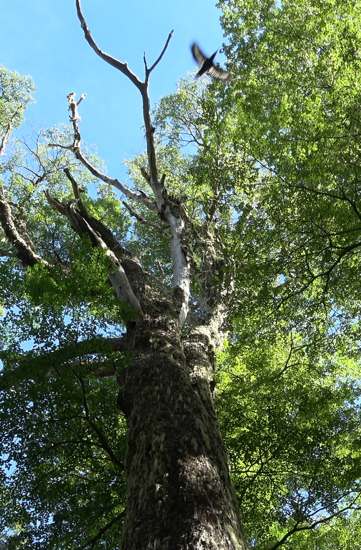 I’m visible in the crown in this photo, which gives an impression of the sturdiness of Tree 5. In the lingo of tree climbers, it contains several “bomber” branches near the top.